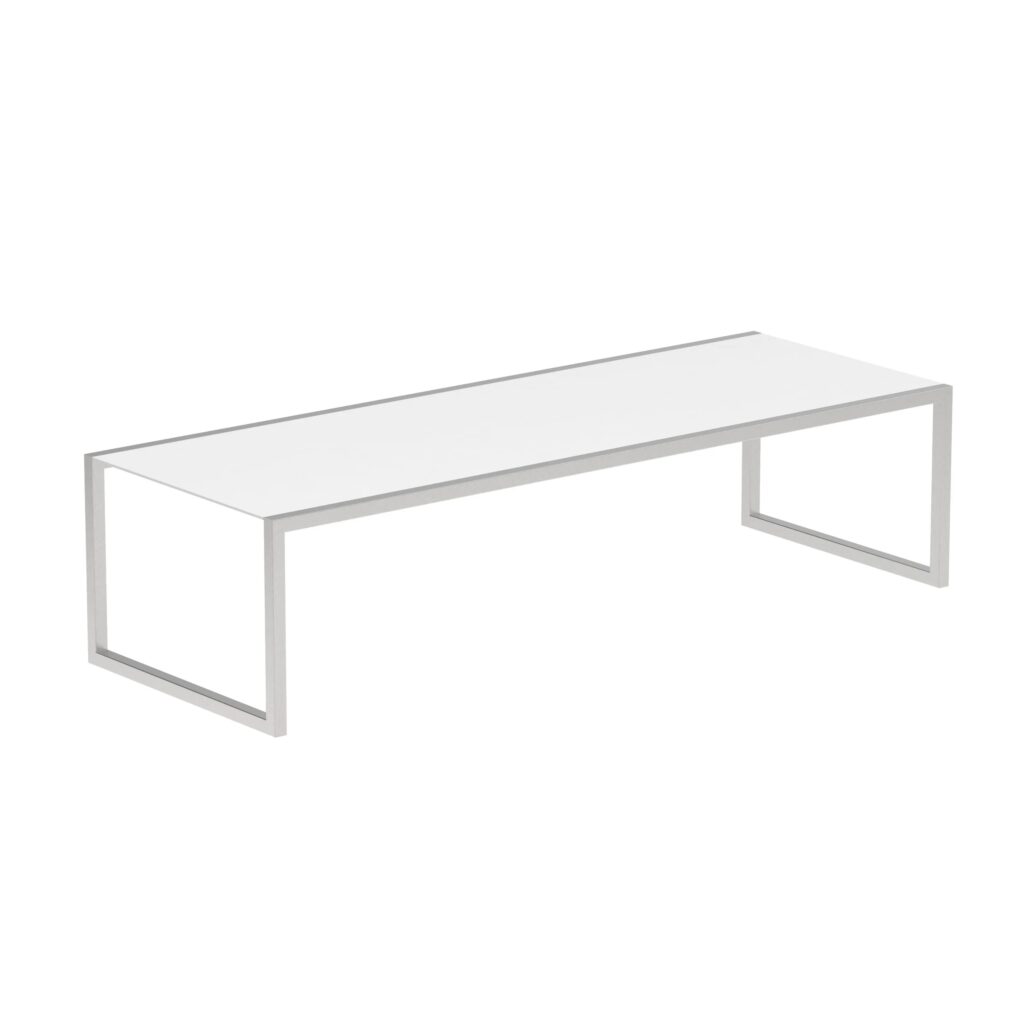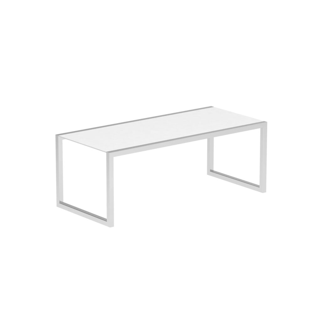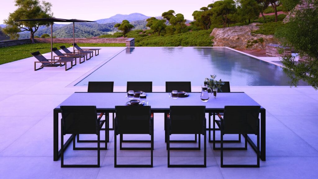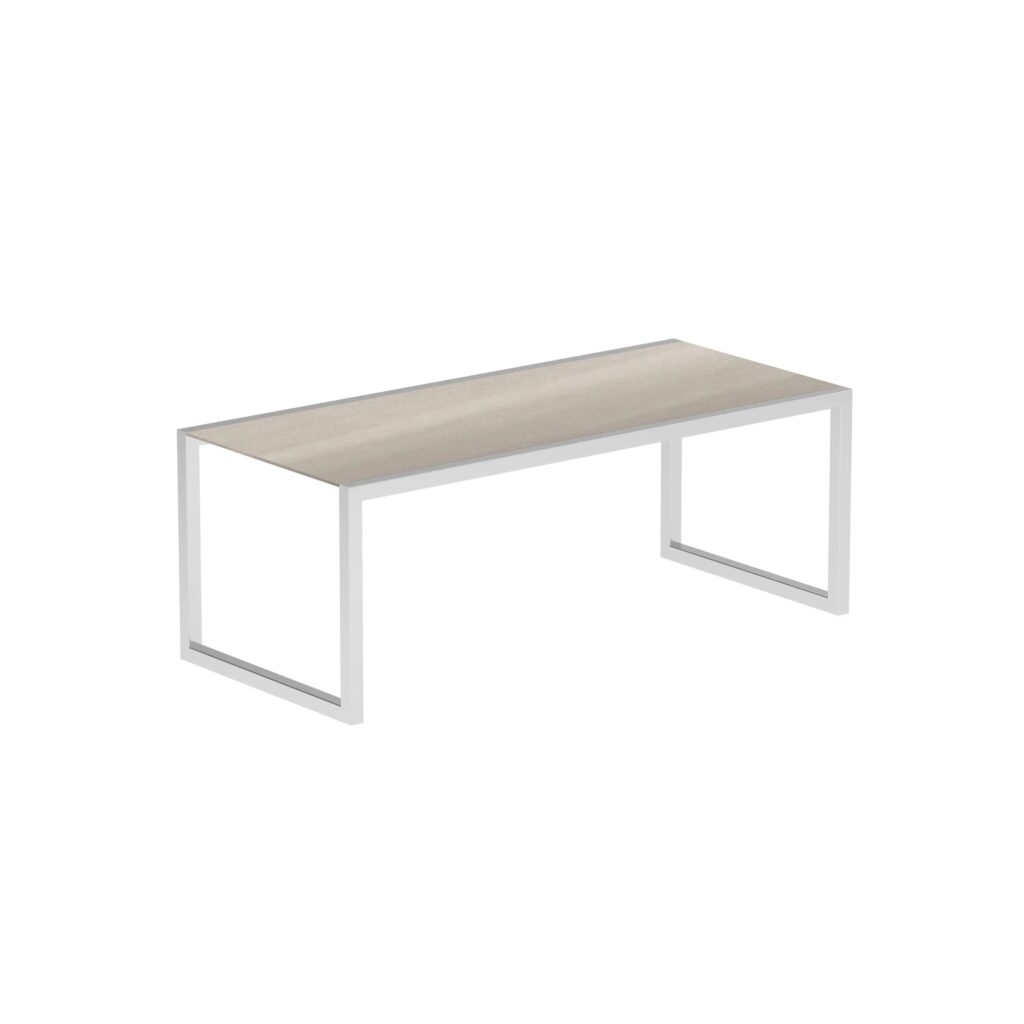 Ninix ist ein rechteckiger Gartentisch aus Edelstahl und einer Platte aus Keramik und Glas, der zur Kollektion NINIX gehört. Erhältlich in drei Grössen.