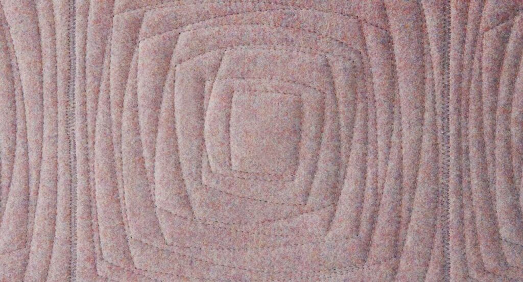 Der Teppich IMPERFETTO wird mit einer doppelten Filzschicht hergestellt. Dieser Teppich wird durch die Verbindung von Filzelementen mit Punto Zigzag hergestellt. Die Oberfläche des Teppichs besteht aus quadratischen Filzelementen von cm. 40 x 40, die mit Punto Matelassé bestickt sind. Die Stickerei auf jedem Element erzeugt ein unregelmäßiges, quadratisches, spiralförmiges Muster. Der Rand ist mit dem Punto Cavallo bestickt. Die Anzahl der Elemente variiert je nach Größe des Teppichs.
