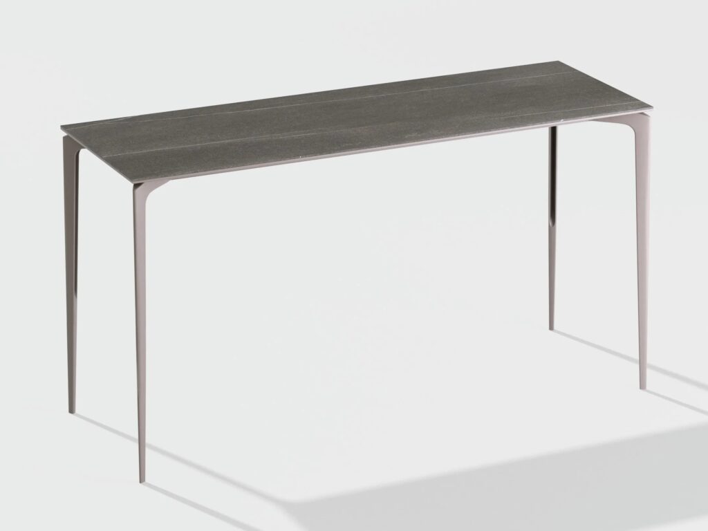Eine Kollektion von Tischen, die sich durch Individualität auszeichnet. Die gesamte AllSize-Kollektion kann sowohl in der Höhe als auch in der Grösse der Tischplatte individuell gestaltet werden. Der geometrische und strenge Stil von AllSize wird durch die Tischplatten aus Feinsteinzeug oder mit Steineffekt hervorgehoben, die auf einem Gestell aus lackiertem Aluminium ruhen und einen interessanten Materialkontrast bilden. Die Beine, der Rahmen und die Stützen sind aus stranggepresstem Aluminium gefertigt. Es ist auch eine Standardversion mit einer Platte aus lackiertem Aluminium erhältlich.