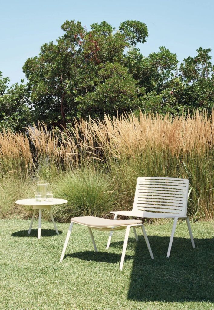 Zur Kollektion Zebra gehören ein Stuhl, wahlweise mit oder ohne Armlehnen, ein Loungesessel, ein auf drei verschiedene Höhen einstellbarer Beistelltisch sowie eine Reihe von Tischen. Sitz und Rückenlehne der Stühle können mit speziell für den Outdoor-Bereich entwickelten Kissen aus Stoff ausgestattet werden, die wasserund ölabweisend sind, UV-beständig sowie abrieb- und spleissfest.