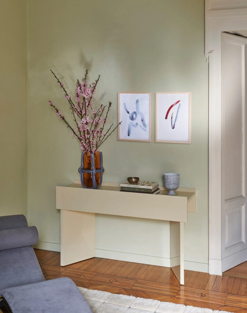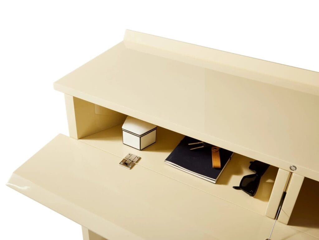 Der für den Eingangsbereich konzipierte Konsolentisch Hayama zeichnet sich ebenfalls durch seine konvergierenden Winkel und die schrägen Beine aus, die seine Platte tragen. Dank der überhängenden Tür, hinter der sich ein in zwei Fächer unterteilter Stauraum verbirgt, eignet sich dieses Möbelstück perfekt zum Ablegen von Gegenständen wie Schlüsseln und anderem Zubehör, wenn man nach Hause kommt.