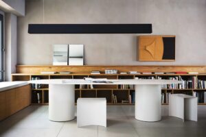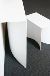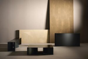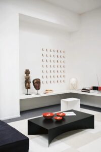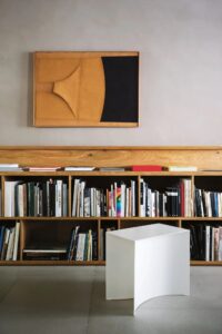 Diese subtile Geste der Subtraktion führt zu einer sehr starken Wirkung, dank der Krümmung des Sockels, der einen Raum definiert, der die visuelle Wahrnehmung der Objekte verändert.