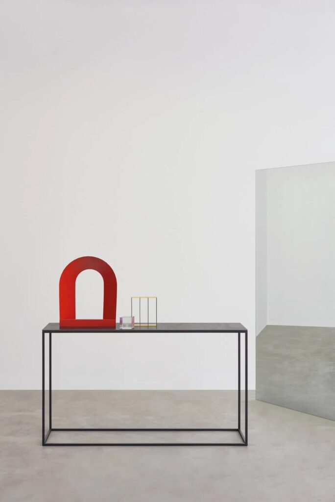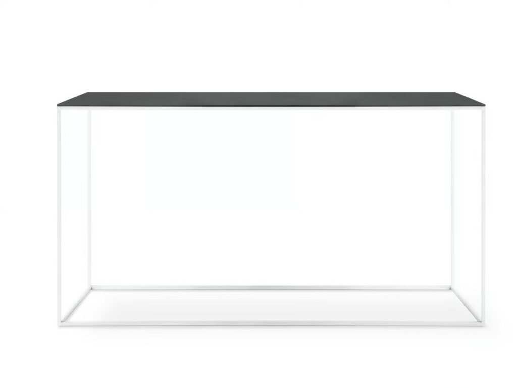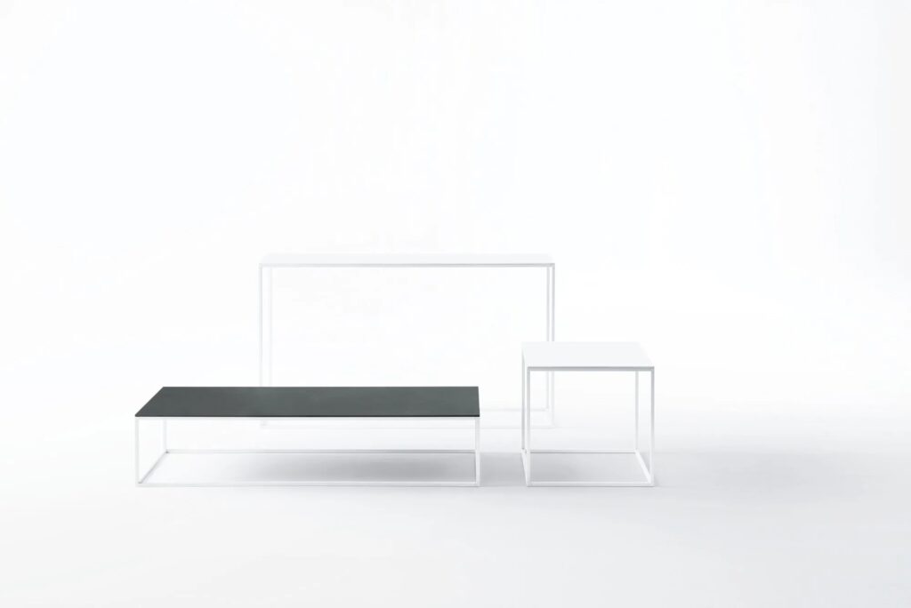 System von Tischchen und Konsolen mit Stahlgestell, Querschnitt 15x15mm und Verbindungselementen aus Druckguss. Gestell in den matt lackierten Ausführungen oder in den exclusiven Desalto Ausführungen. Platten aus Glas oder Keramik.