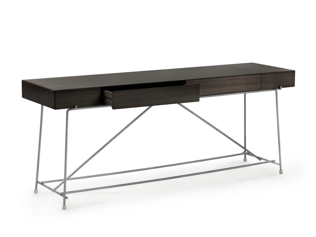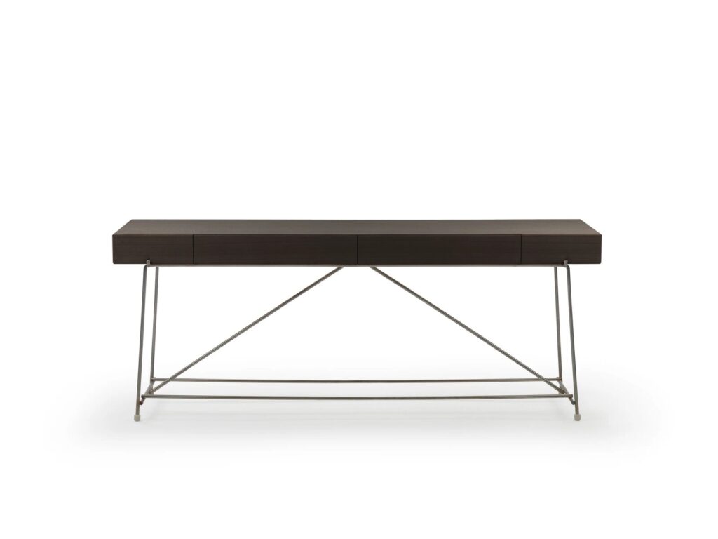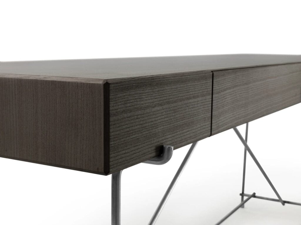 Auf dem nüchternen Gestell aus Edelstahl liegt ein Element mit Furnier aus Canaletto Nussbaum in vielen Ausführungen und mit praktischen Schubladen auf. Die Tischplatte kann in Holz oder in verschiedenen Marmorsorten ausgeführt werden.
