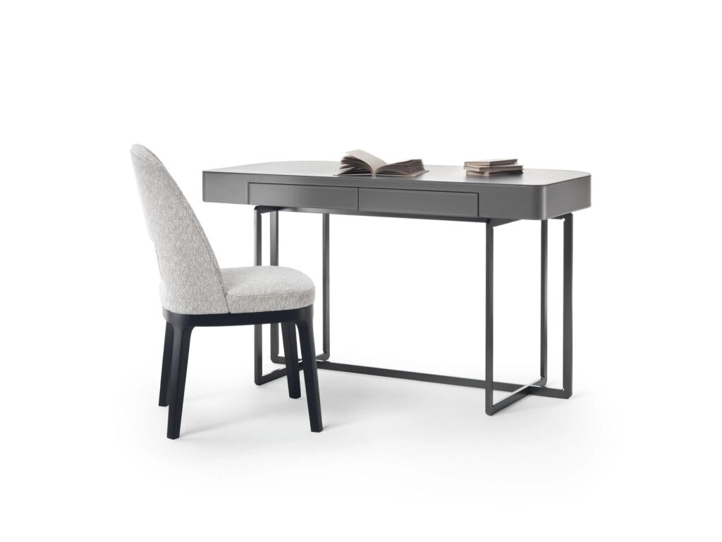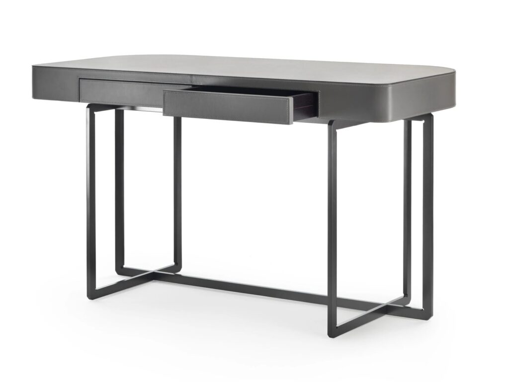 Eine Kollektion eleganter, raffinierter runder, quadratischer und rechteckiger Tische. Die Struktur ist aus Metall, mit einer originellen grafischen Note auf dem Bein. Die Tische werden durch Marmorplatten in Pinta Verde - einem weißen, kristallinen Marmor mit sanften grünen Schattierungen - und Verde Alpi, mit dunklem Hintergrund und grünen Adern, ergänzt. Zur Familie gehört auch ein kleiner Schreibtisch mit Schubladen auf demselben Metallsockel wie die Tische und mit einer eleganten, mit Rindsleder bezogenen Platte. Ein Schmuckstück, das die Bedürfnisse eines Home-Office in einer Wohnung erfüllen oder den Räumen eines Boutique-Hotels einen eleganten Touch verleihen kann.