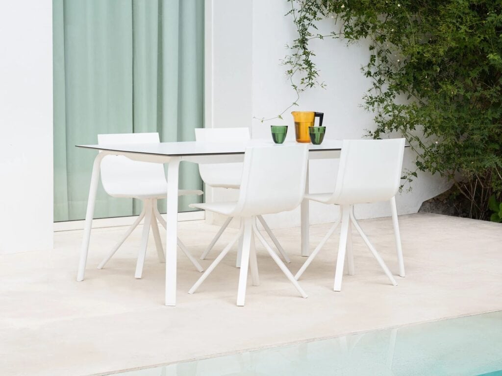 Hergestellt aus thermolackierten, geschweissten Aluminiumprofilen, Phenolplatte und Batyline-Stoff. Die Sitzpolster sind mit wasserabweisendem Stoff überzogen. Abziehbarer Bezug.