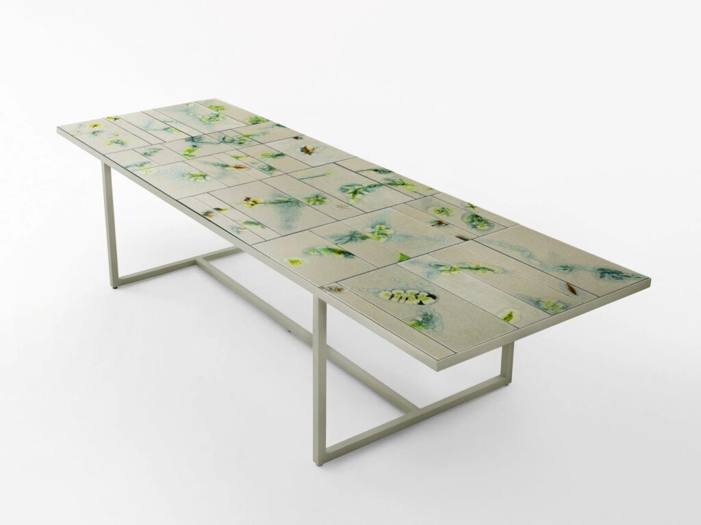 Zu den 2016 eingeführten Sciara Beistelltischen gesellt sich in diesem Jahr ein neuer Esstisch. Die Struktur besteht aus Edelstahl mit Délabré-Finish, einer exklusiven Veredelung von De Castelli; die Platte besteht aus quadratischen Lavasteinfliesen, die von Hand geschnitten und mit geschmolzenem Glas verziert werden. Jede Fliese ist ein Einzelstück und wird nach ästhetischen Kriterien, die auf den beim Schmelzvorgang entstehenden Farbnuancen basieren, für die Kombination mit den anderen ausgewählt.