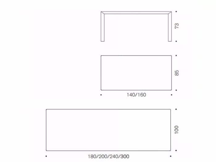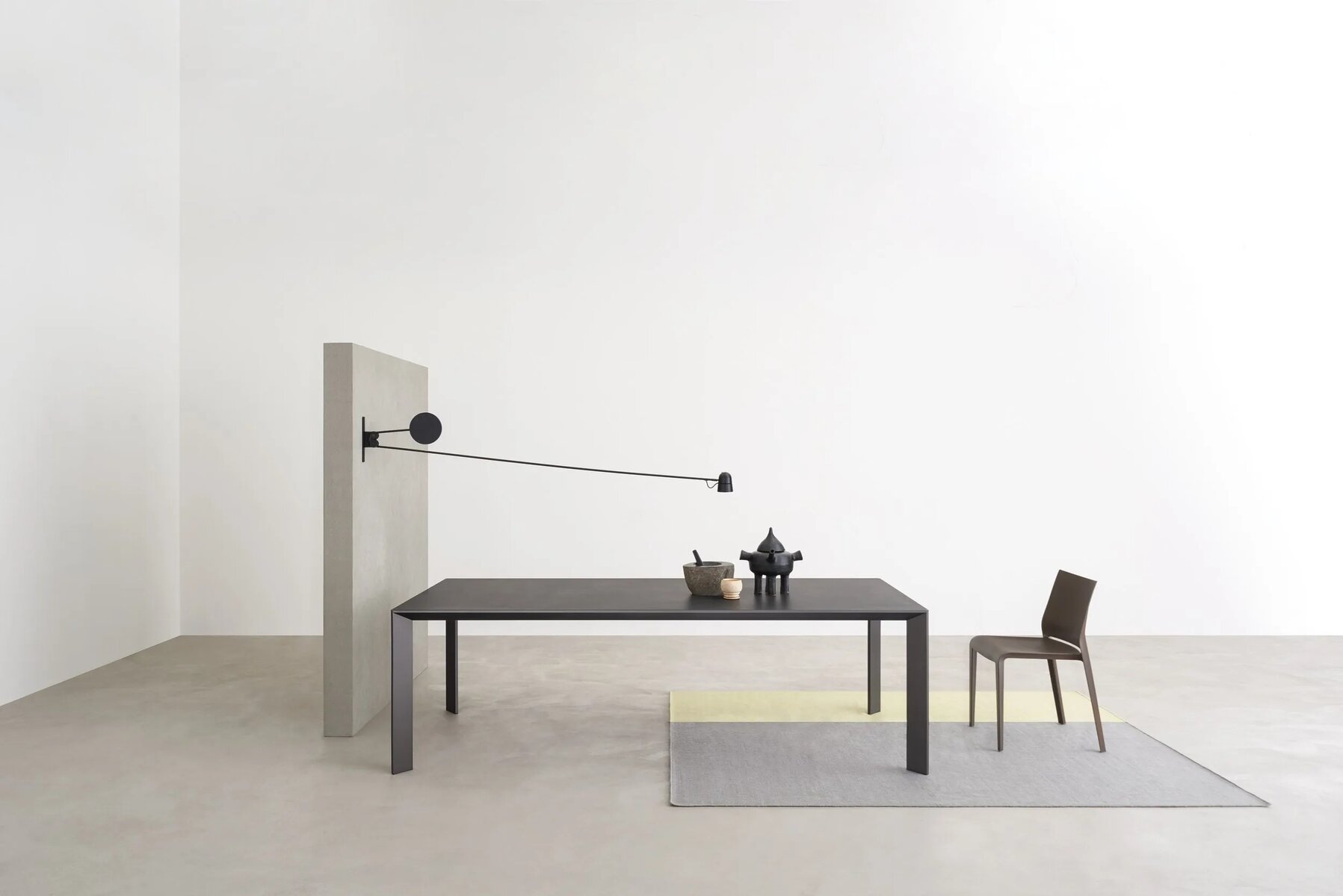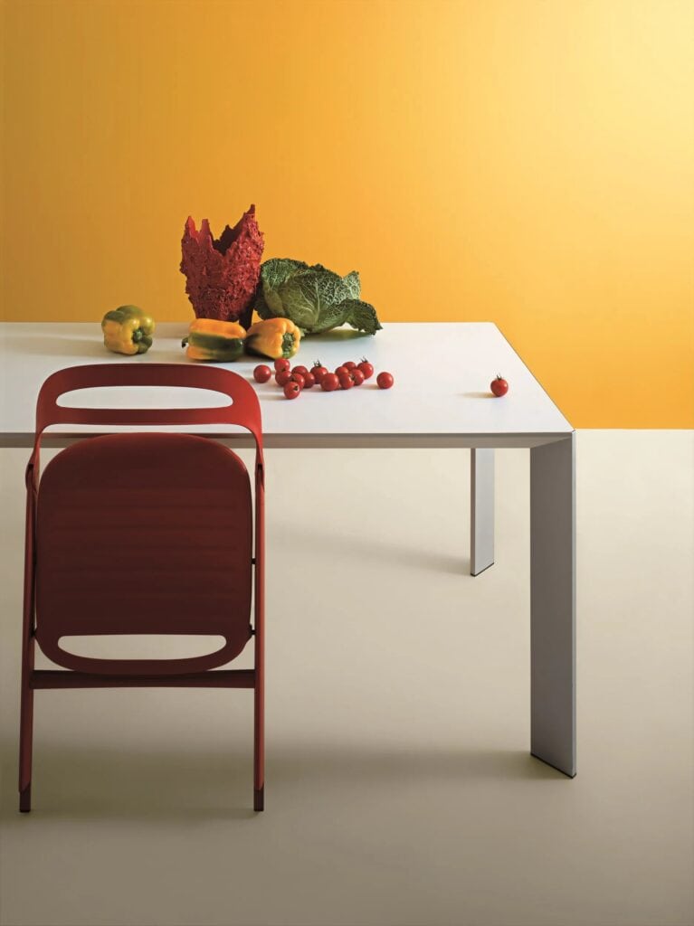 Tisch mit Gestell aus Fliesspressaluminium und Verbindungselementen aus Druckguss. Eingebaute Tischplatte aus temperiertem Glass 8mm, Keramik, Laminat, oder Holz. In einigen Varianten auch für Outdoor erhältlich.