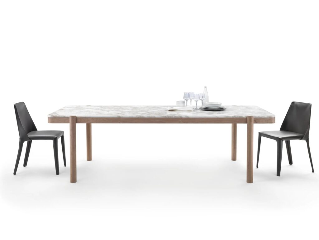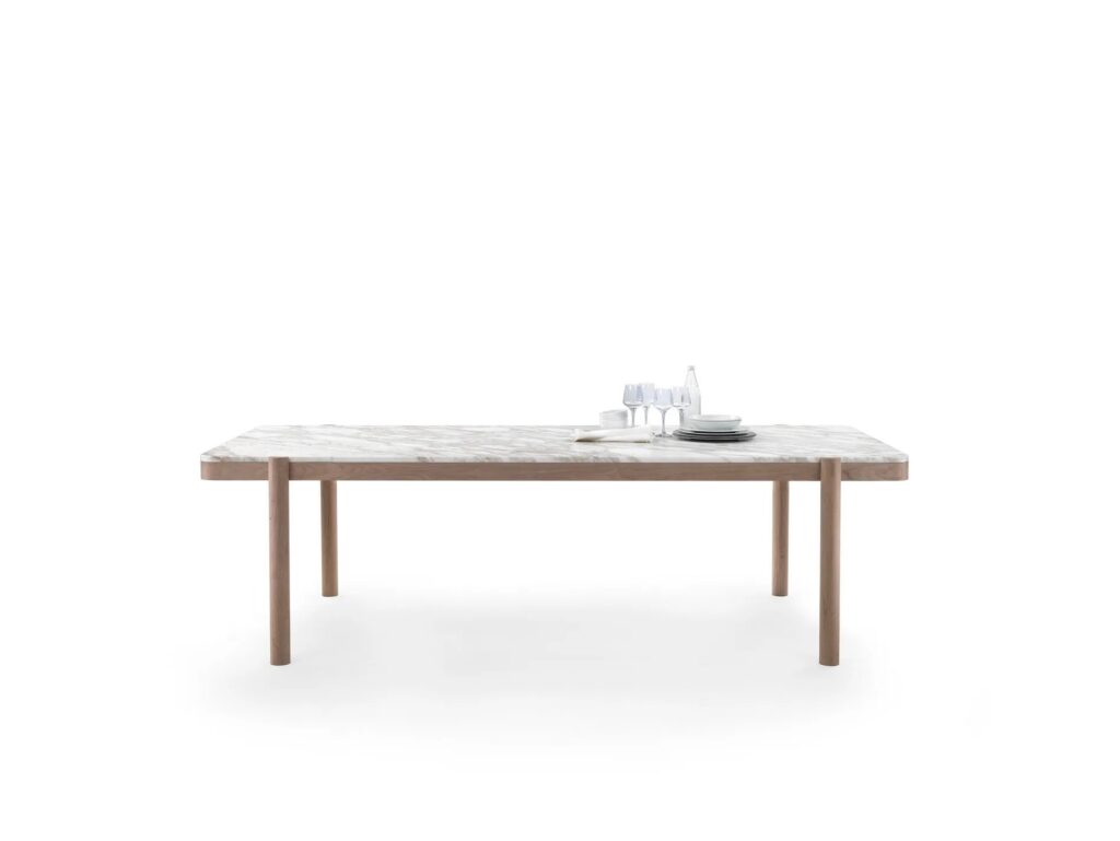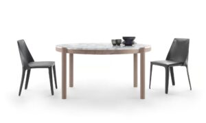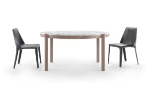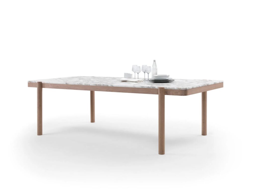 Das Design des Tisches Gustav zeigt die Aufmerksamkeit für raffinierte Details, wie die Verbindung des gedrehten, massiven Holzbeins mit der Tischplatte. Ein Detail, das auf den ersten Blick einfach erscheint, aber eine erhebliche Komplexität der Bauweise verbirgt. Der Tisch Gustav ist rund oder rechteckig, in verschiedenen Maßen erhältlich und wird in einer Reihe von originellen Materialkombinationen vorgeschlagen, mit Struktur aus Massivholz in der Version Amerikanischer Nussbaum oder Esche in verschiedenen Färbungen und einer Tischplatte aus Marmor, erhältlich in den Ausführungen Weißer Carrara-Marmor, Nero Marquina, Calacatta Oro und Emperador.