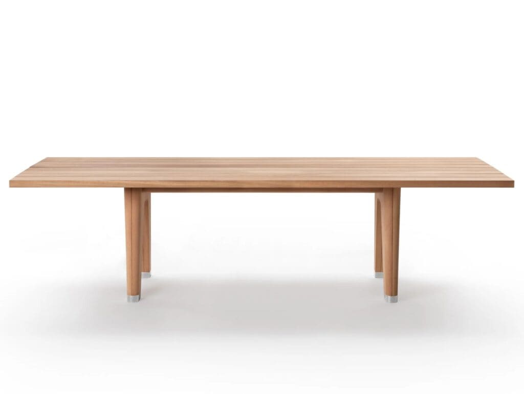 Zwei Jahre nach der Lancierung des Tischs Monreale bietet Flexform jetzt auch die Outdoor-Version komplett aus Iroko. Der warme, materische Charakter des Holzes und seine hervorragende Wetterbeständigkeit verleihen dem Tisch Monreale Outdoor eine starke Persönlichkeit. Jedes Detail des Tischs Monreale Outdoor enthüllt seine komplexe Bauweise, die sich hinter einer augenscheinlichen Schlichtheit verbirgt. Die eindrucksvollen und zugleich essentiellen Beine aus massivem Iroko unterstreichen den erhabenen und nüchternen Aspekt, der diesen Tisch auszeichnet. Die Gleiter aus Metalllegierung mit Nyloneinsätzen, die in gefräste Löcher in die Tischbeine eingesetzt werden, schützen das Holz vor dem direkten Kontakt mit dem Boden. Die Tischplatte besteht aus Latten aus massivem Iroko, verfügbar in den Ausführungen Natur oder Grau gebeizt und Weiß lackiert.