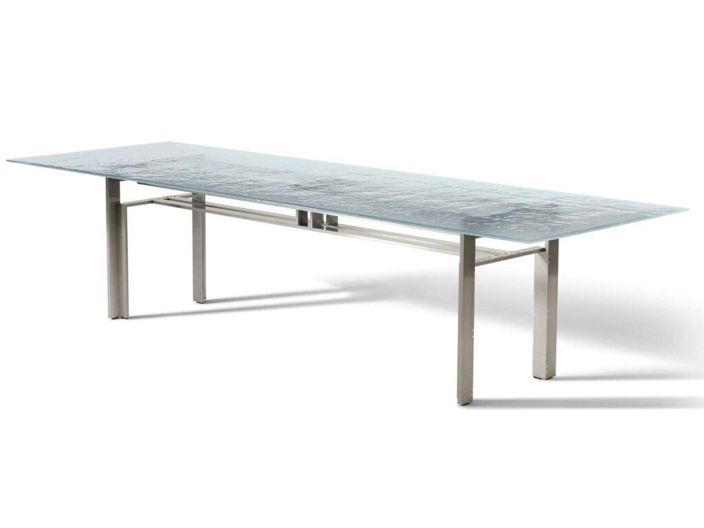 Die Eleganz des Glases wird durch die Abschrägung der Platte noch verstärkt, die am Rand ausgeführt wird, um die Kontur zu verschlanken und einen transparenten kristallinen Rahmen zu formen, ein raffiniertes Detail, das einen Kontrast zum zentralen Teil des Tisches bildet. Doge ist in zwei Dimensionen erhältlich und behält seinen ikonischen skulpturalen Stahlsockel bei, der den architektonischen Charakter des Tisches unterstreicht.