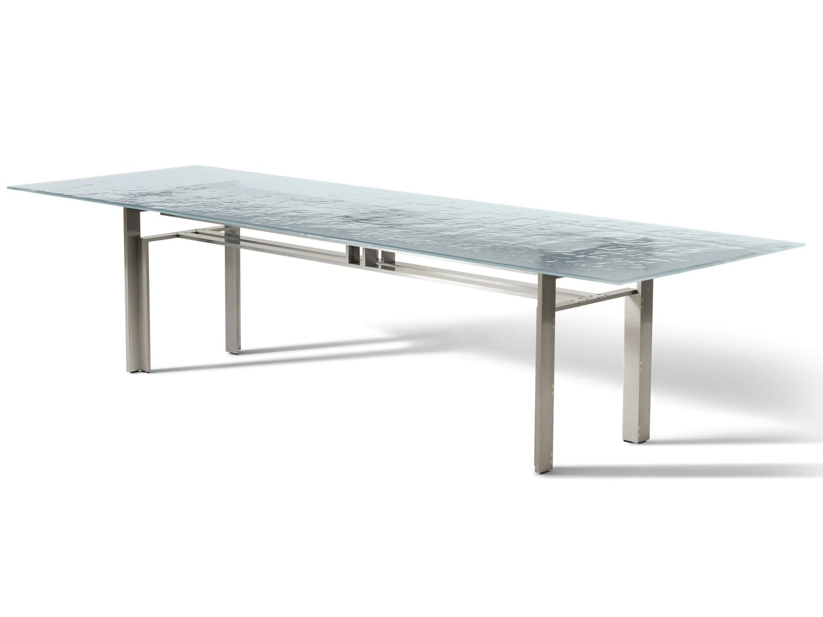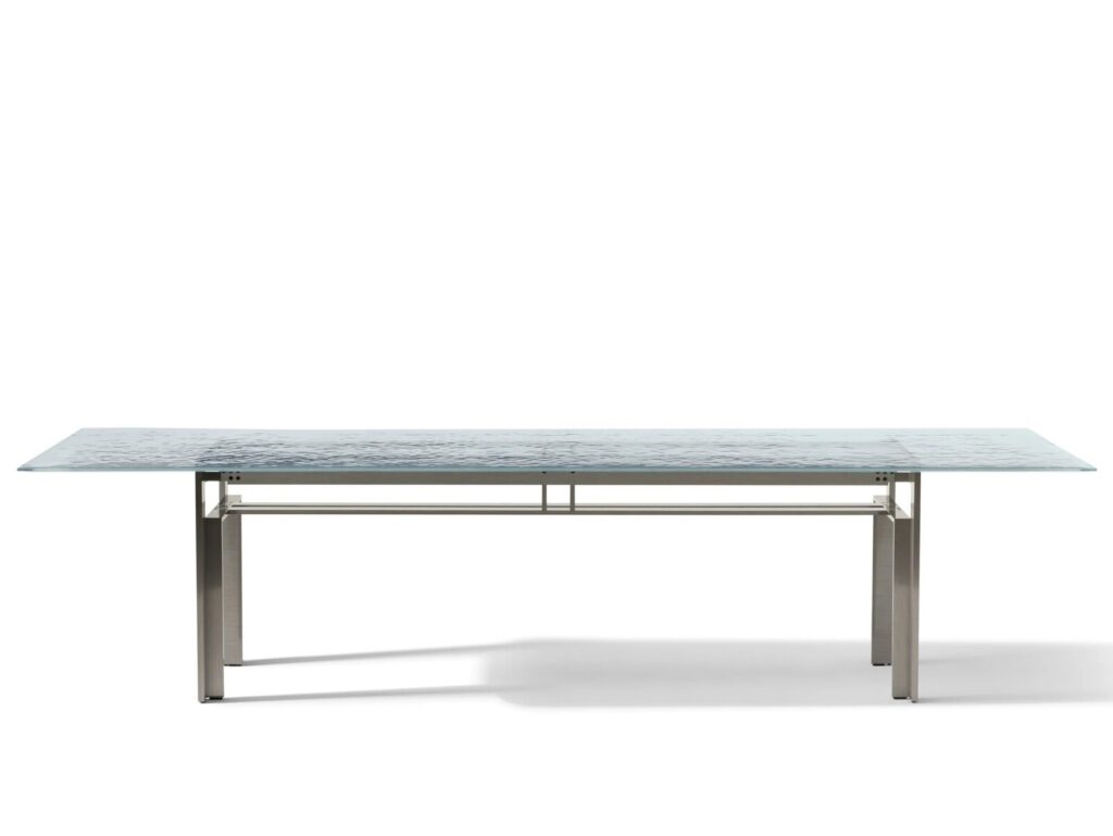 Die Wellen der venezianischen Lagune spiegeln sich in der extraklaren Glasplatte des Tisches Doge Laguna wider. Als Hommage an die antike Glasmacherkunst werden die Spiegelungen der Wellen in dieser neuen Ausführung durch eine aufwendige Verarbeitung nachempfunden. Die Glasplatte wird sandgestrahlt, um die Opazität zu erhöhen, und dann getempert, ein Prozess, der den charakteristischen Welleneffekt der Platte erzeugt, der zu einem strukturierten und wellenförmigen Muster führt.