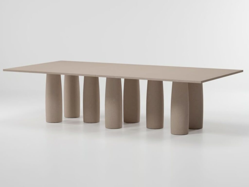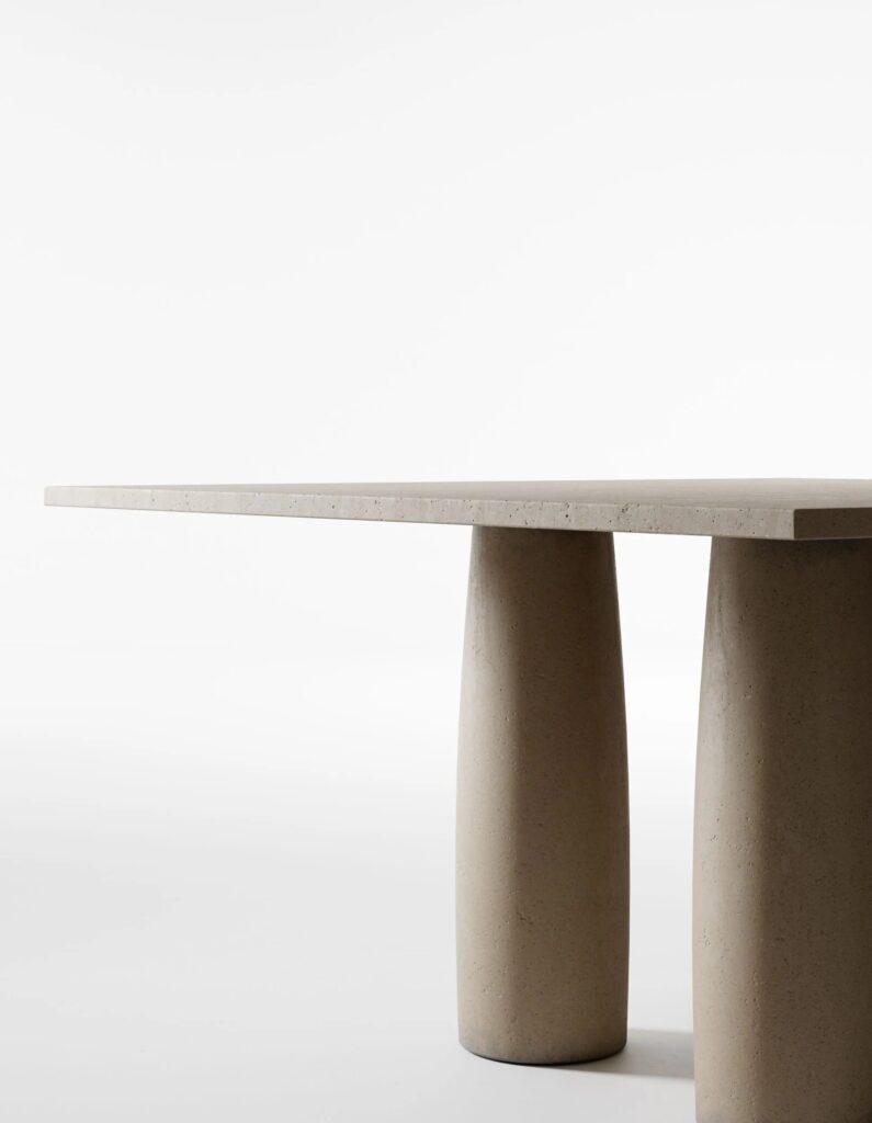 Für dieses Projekt wurde Mario Bellini von einer elementaren und grundlegenden architektonischen Struktur inspiriert. Das Design ahmt die klassische Architektur nach, bei der eine Reihe von Säulen einen Torbogen stützt, in diesem Fall eine Tischplatte.