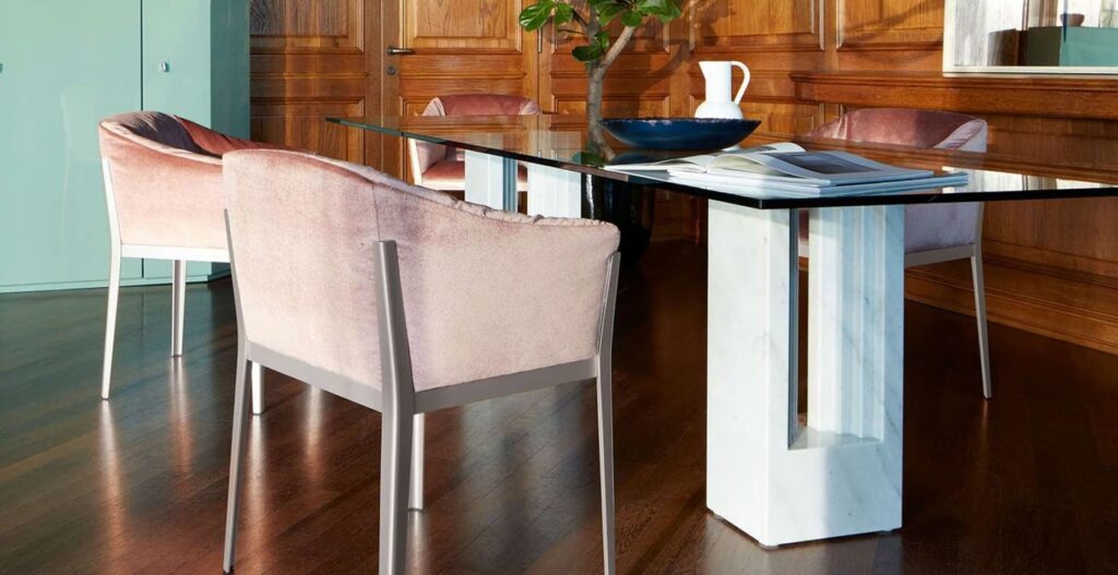 Delfi gehört zur Kollektion Ultrarazionale, die 1968 ins Leben gerufen wurde. Sie umfasst skulpturenhafte Stücke von Carlo Scarpa, bei denen besonders viel Augenmerk auf die Details, die Verarbeitungen und die Auswahl der Materialien gelegt wurde. Der Tisch ist ein Neuentwurf des rationalen Modells, das Marcel Breuer in den 30er Jahren für Dino Gavinas Wohnung in Bologna entworfen hatte. Gegen Ende der 60er Jahre begann Scarpa mit einer Umwertung des ursprünglichen Konzepts und nahm einige Veränderungen vor, mit denen der Autor einverstanden war. 2009 bot dann Tobia Scarpa eine neue Variante mit Tischplatte aus Kristallglas an, die den Blick auf die raffinierten Stützen aus Messing und die Kannelierung der Marmorbasis freigibt und die Eleganz der Formen betont.
