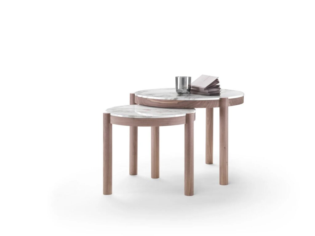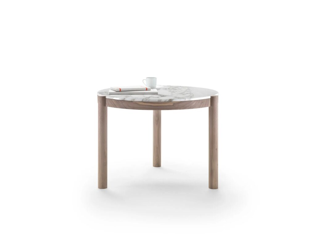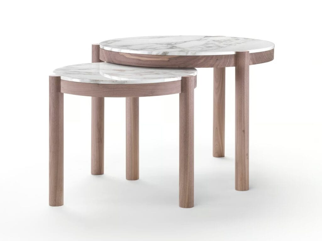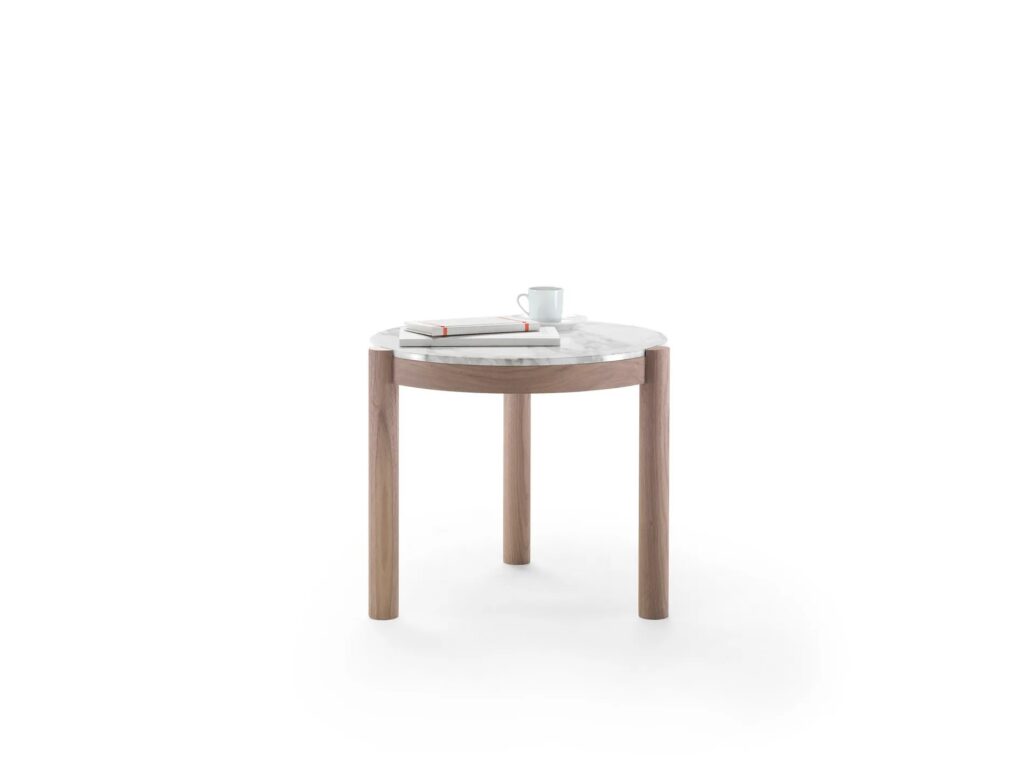 Eine Serie mit Tischen und Beistelltischen, die sich durch ihr klares Design und ihre Zweckmäßigkeit auszeichnen. Hinter den elegant ausgeführten Details, wie die Verbindung des Beins mit der Tischplatte, verbirgt sich die Komplexität einer Bauweise, die nur auf den ersten Blick einfach erscheint. Charakterisiert sind die Tische durch die exklusiven materischen Kombinationen des Gestells aus Massivholz in der Version Amerikanischer Nussbaum oder Esche und der bündig eingefügten Tischplatte aus Marmor, erhältlich in den Ausführungen Weißer Carrara-Marmor, Nero Marquina, Calacatta Oro und Emperador. Die Beistelltische Gustav sind als ideale Beimöbel für die Sitzmöbel der Kollektion gedacht und weisen nicht nur eine starke Persönlichkeit auf, sondern auch eine Attitude, die sowohl bei einzeln gestellten Tischen als auch bei in kleinen Gruppen arrangierten Tischen, die eine spielerische Anordnung zulassen, optimal zum Tragen kommt.