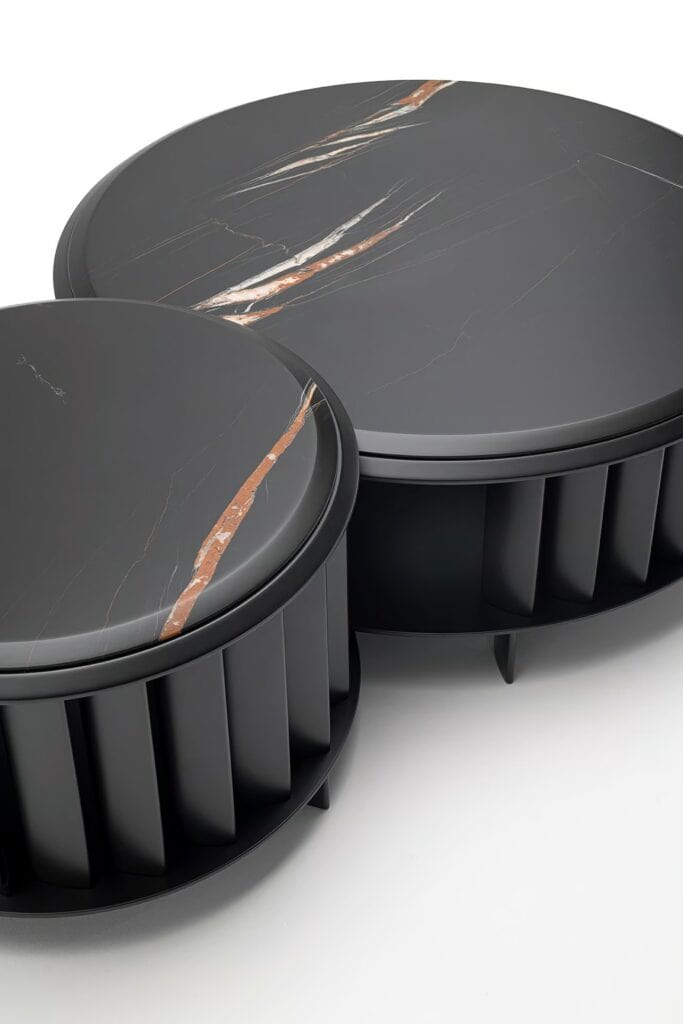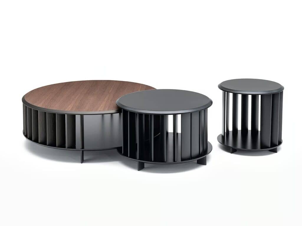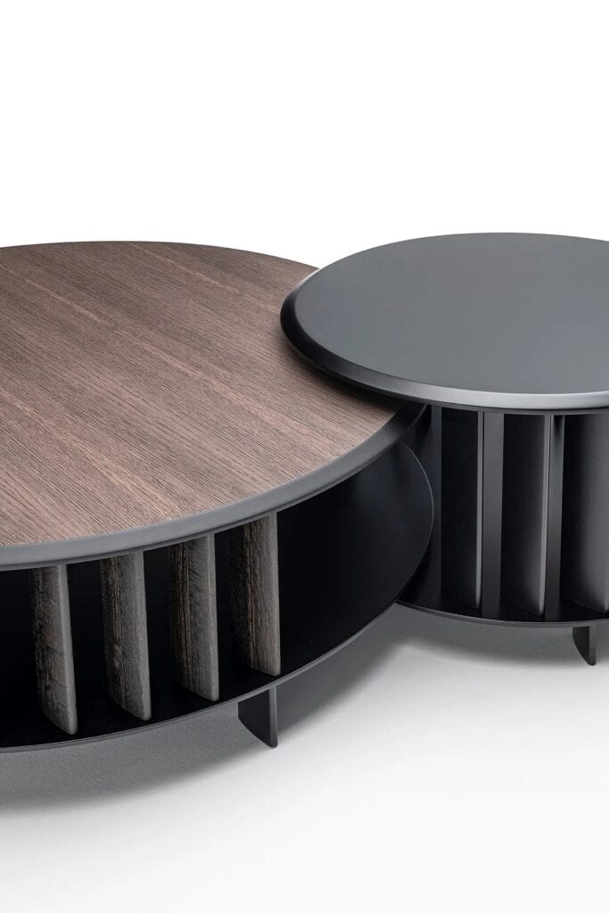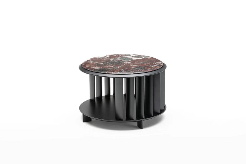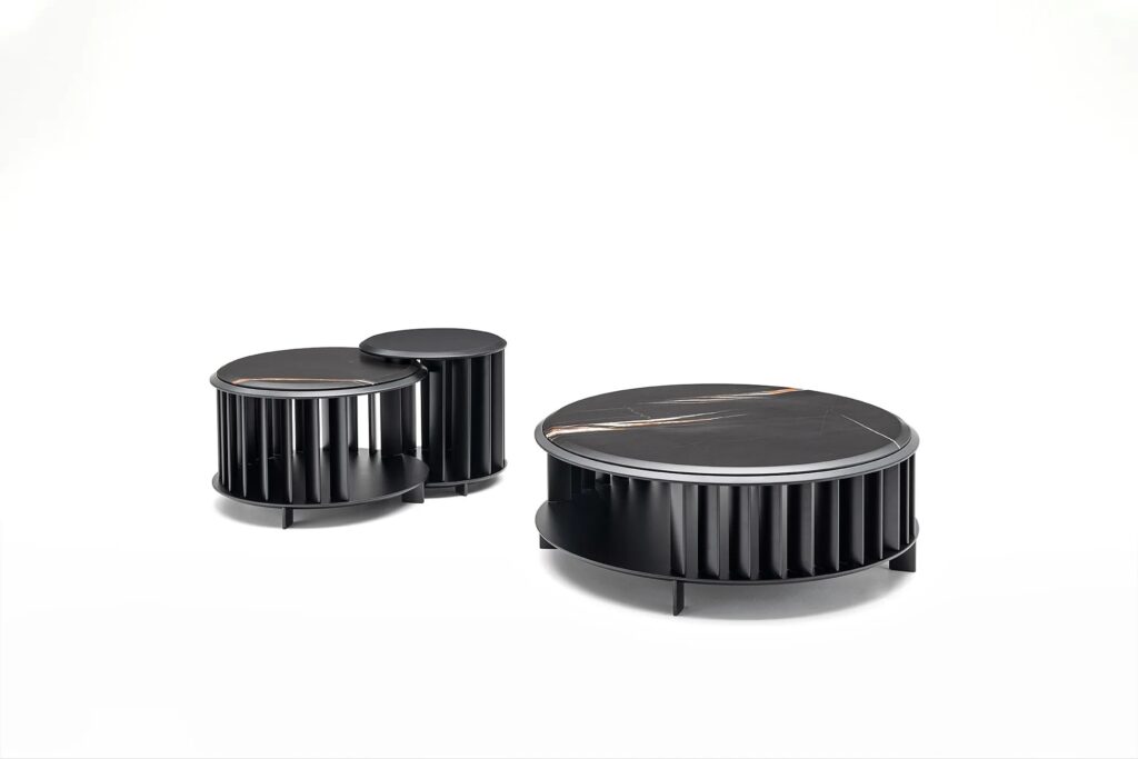 ISLANDS ist eine Serie von Couchtischen in drei verschiedenen Höhen und Durchmessern, die dank einer Reihe von schwenkbaren Lamellen über den gesamten Umfang zugänglich sind und sowohl für den Innen- als auch für den Aussenbereich erhältlich sind.