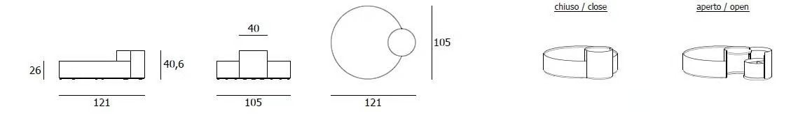 Moon Eclipse: Beistelltisch bestehend aus zwei Elementen, einem festen Ø105cm H.25cm, mit dem ein zweiter Ø40cm H.40cm verbunden ist, mit einem zu öffnen Teil, der mit einem drehbaren und herausnehmbaren Behälter ausgestattet ist - geeignet zur Aufbewahrung von Flaschen und Gläsern - ausgestattet mit drehbaren Rädern. Die zwei Teile sind durch unsichtbare Scharniere verbunden, und der Verschluss wird durch Magnete gewährleistet, die in die Struktur eingesetzt sind.