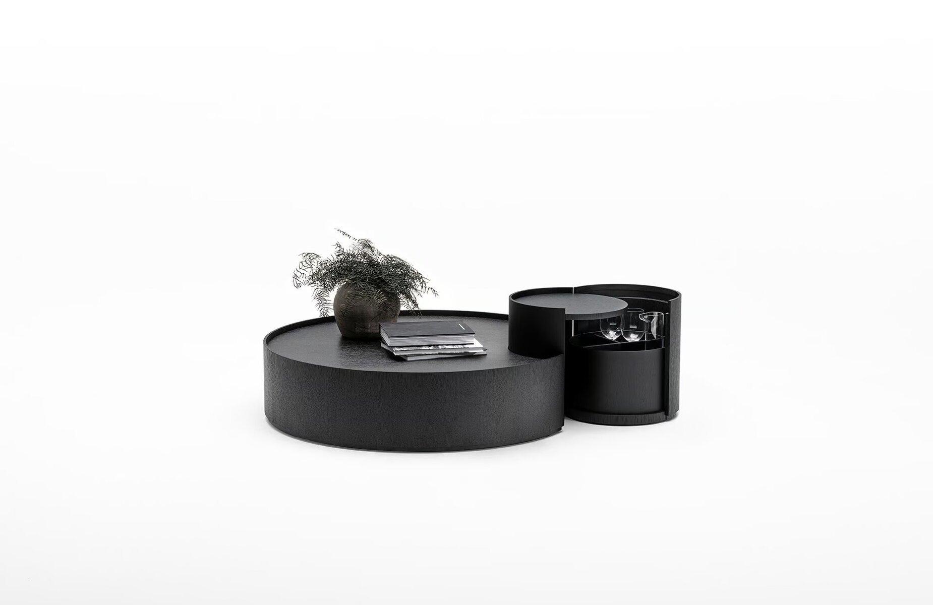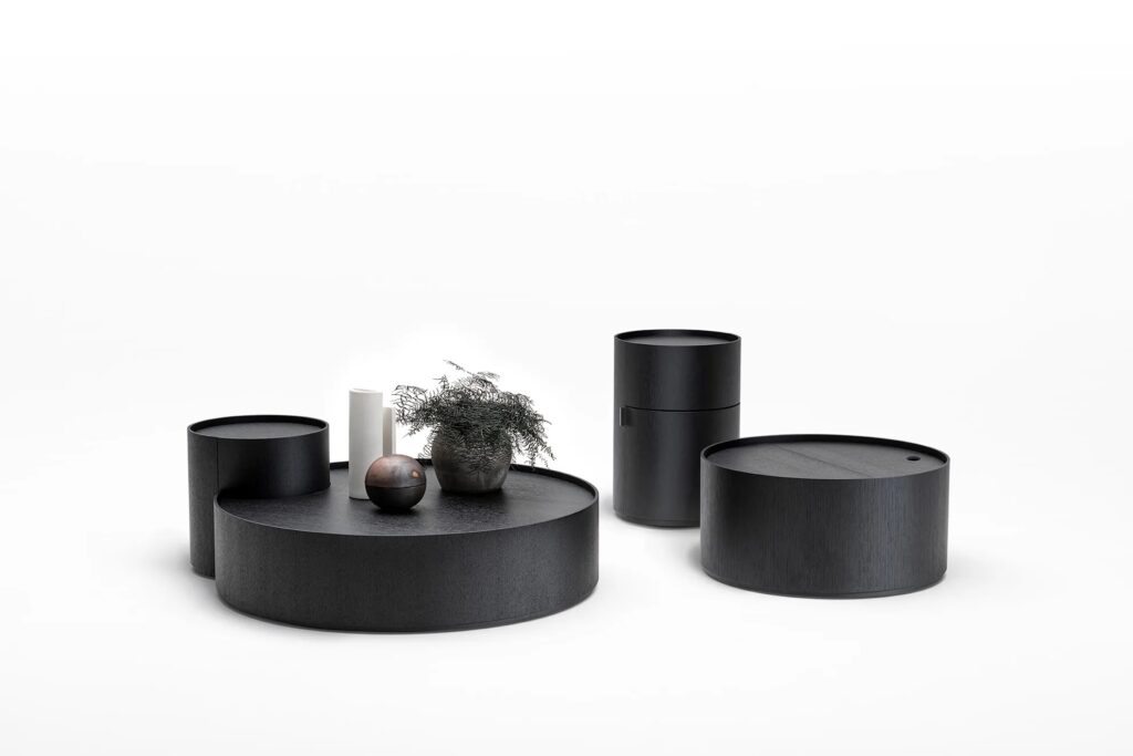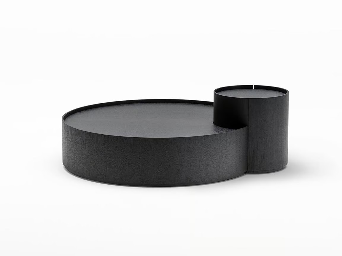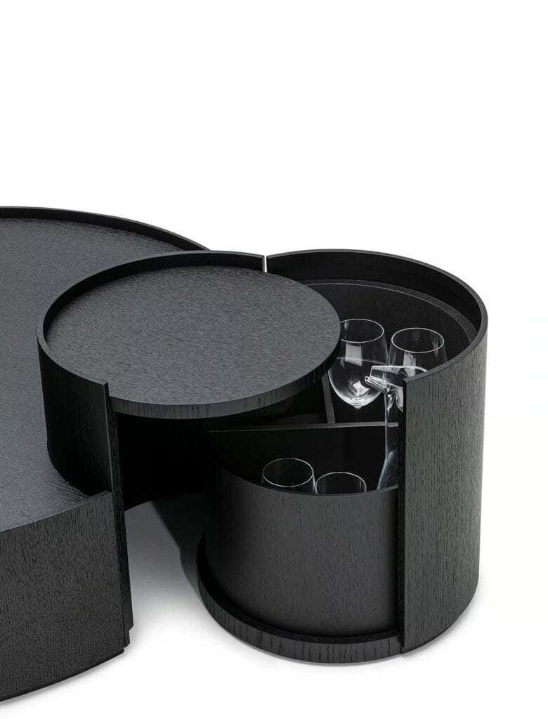 Serie kleiner Tische in verschiedenen Höhen und Durchmessern mit festen und zu öffnen Elementen, bestehend aus Zylindern und Halbzylindern aus gebogenem 7mm starkem Sperrholz in Eiche natur oder karbonfarbig furniert, mit Acryllack auf Wasserbasis. Basis, innere Regale und Top aus 15mm dickem MDF in Eiche furniert; abnehmbare schwenkbare Bestandteile mit verschiedenen Kapazitäten aus mattschwarz lackiertem MDF.