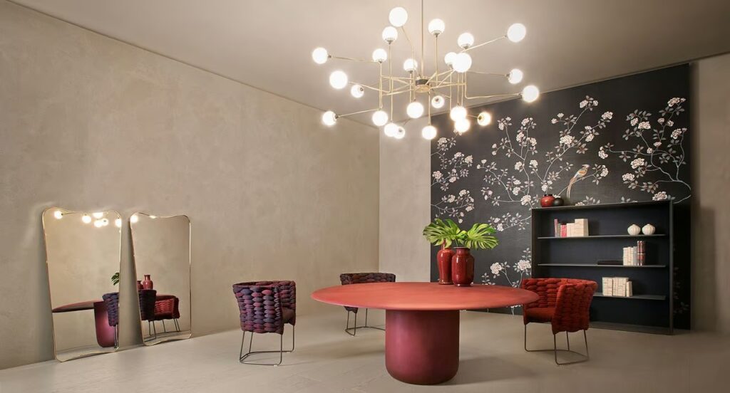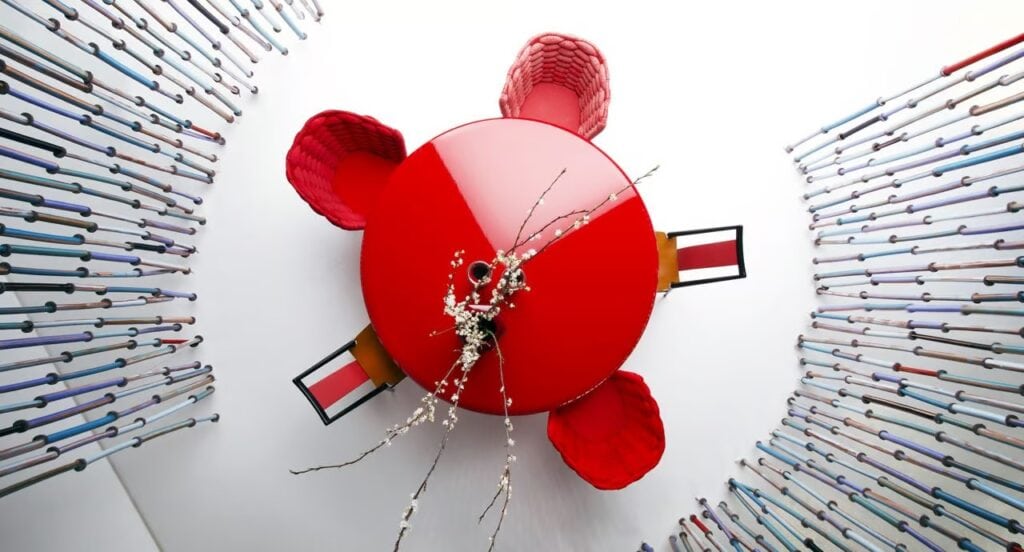 Die Lackierung des Tisches Gon ist ein mechanisches Industrieverfahren. Die Farben der Mano Lucida-Muster sind daher nur chromatische Referenzen: Die maschinelle Lackierung von Gon gibt nicht die Textur wieder, die durch die manuelle Lackierung der Mano Lucida-Produkte entsteht. Die Ornué-Lackierung wird von De Castelli auf einer exklusiven Basis hergestellt.