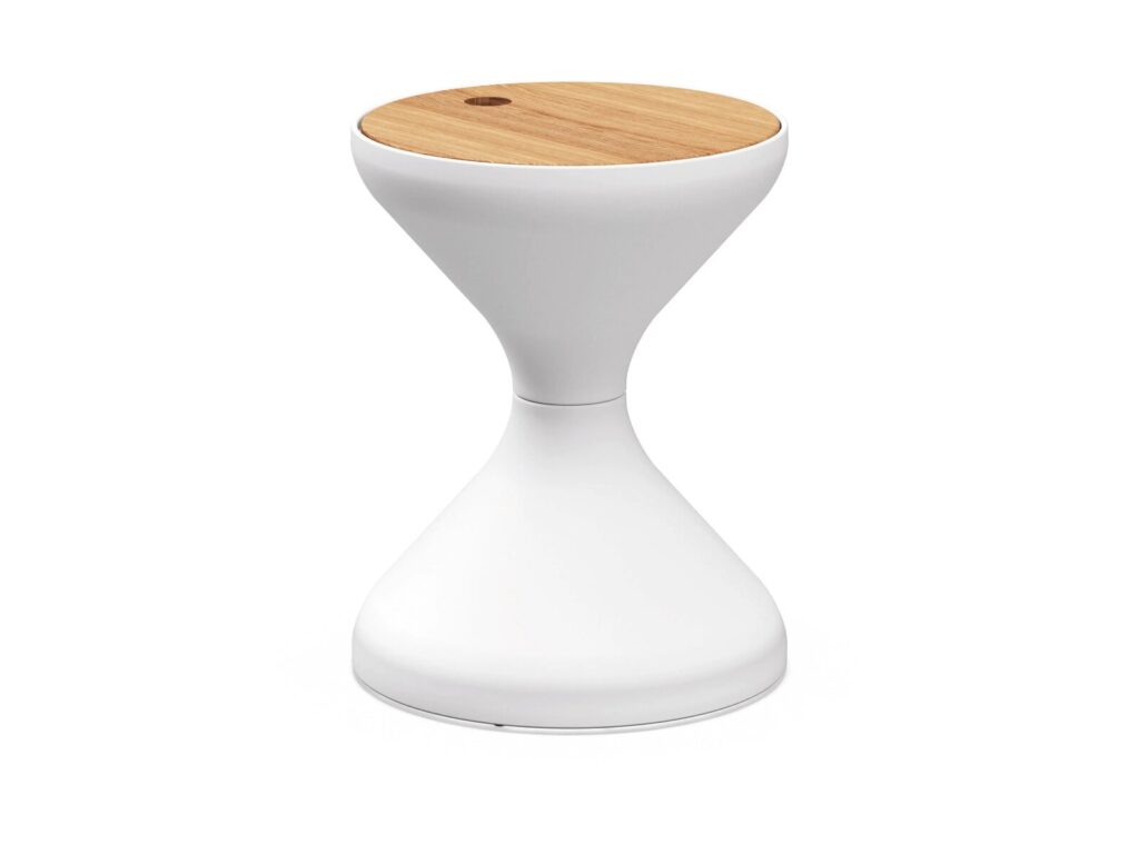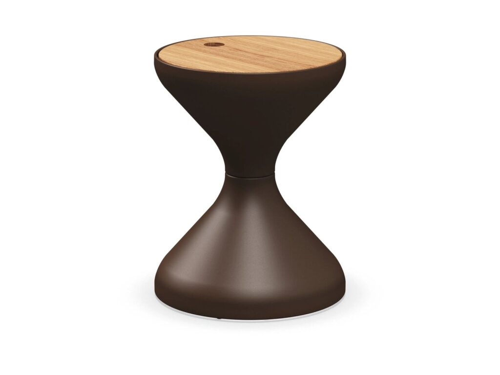 Bells - Runder Beistelltisch aus Aluminium und Teakholz für den Garten. Die Inspiration für die Bells-Kollektion liegt auf der Hand: zwei Glocken, die zusammengefügt die Form dieses ikonischen Beistelltischs bilden, sind ein geschwungener Klassiker. Die organischen und fliessenden Linien sind ein echter Blickfang für jeden Aussenbereich. Dank der verschiedenen Gestellfarben gibt es einen Bells-Tisch, der zu jedem Outdoor-Stil passt.