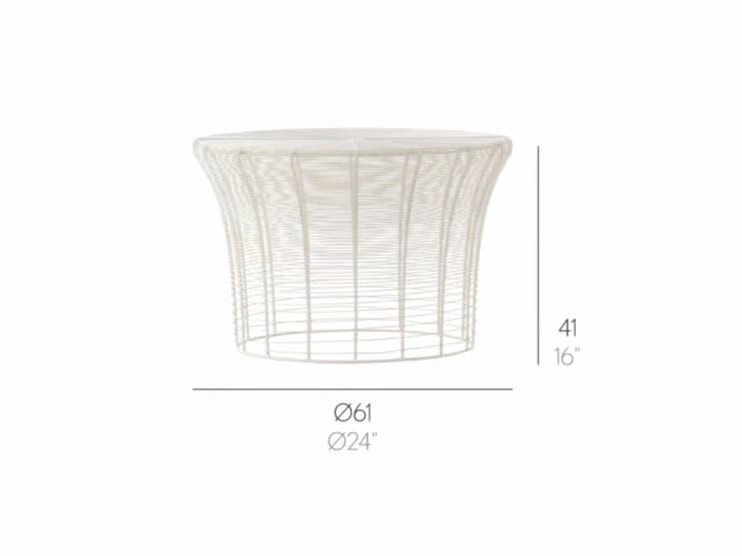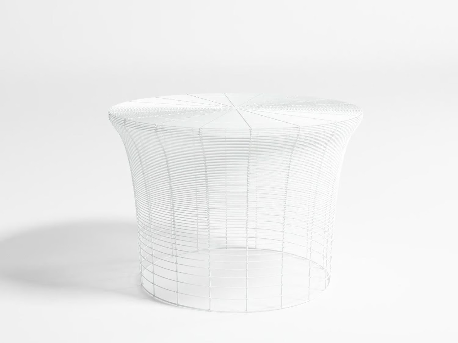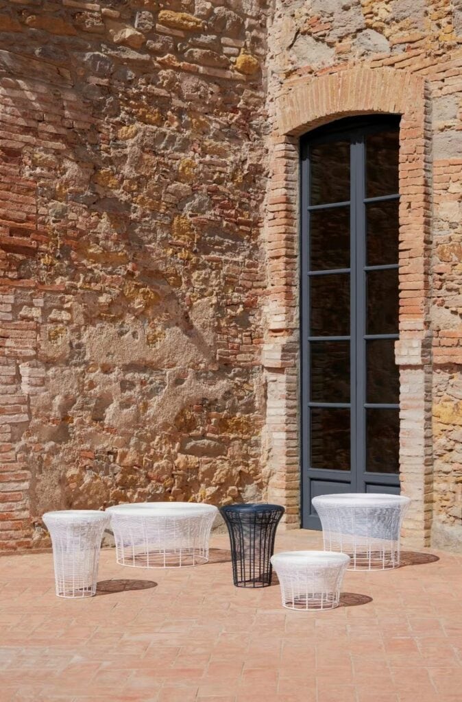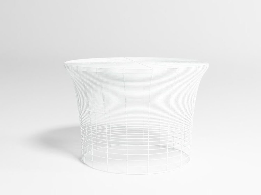 “Diese Kollektion von Hockern und Beistelltischen wird mittels der in Indien traditionellen Technik des Verflechten von Drähten rund um eine Struktur aus Metall hergestellt. Die zwischen den Drähten verbleibenden Zwischenräume werden schrittweise ausgedehnt, sodass ein Abstufungseffekt entsteht. Es handelt sich folglich um ein Design, das durch eine Änderung an einer schon vorhandenen Technik geschaffen wird.”