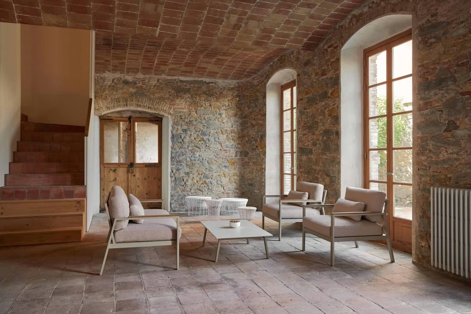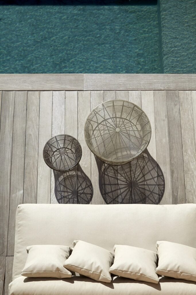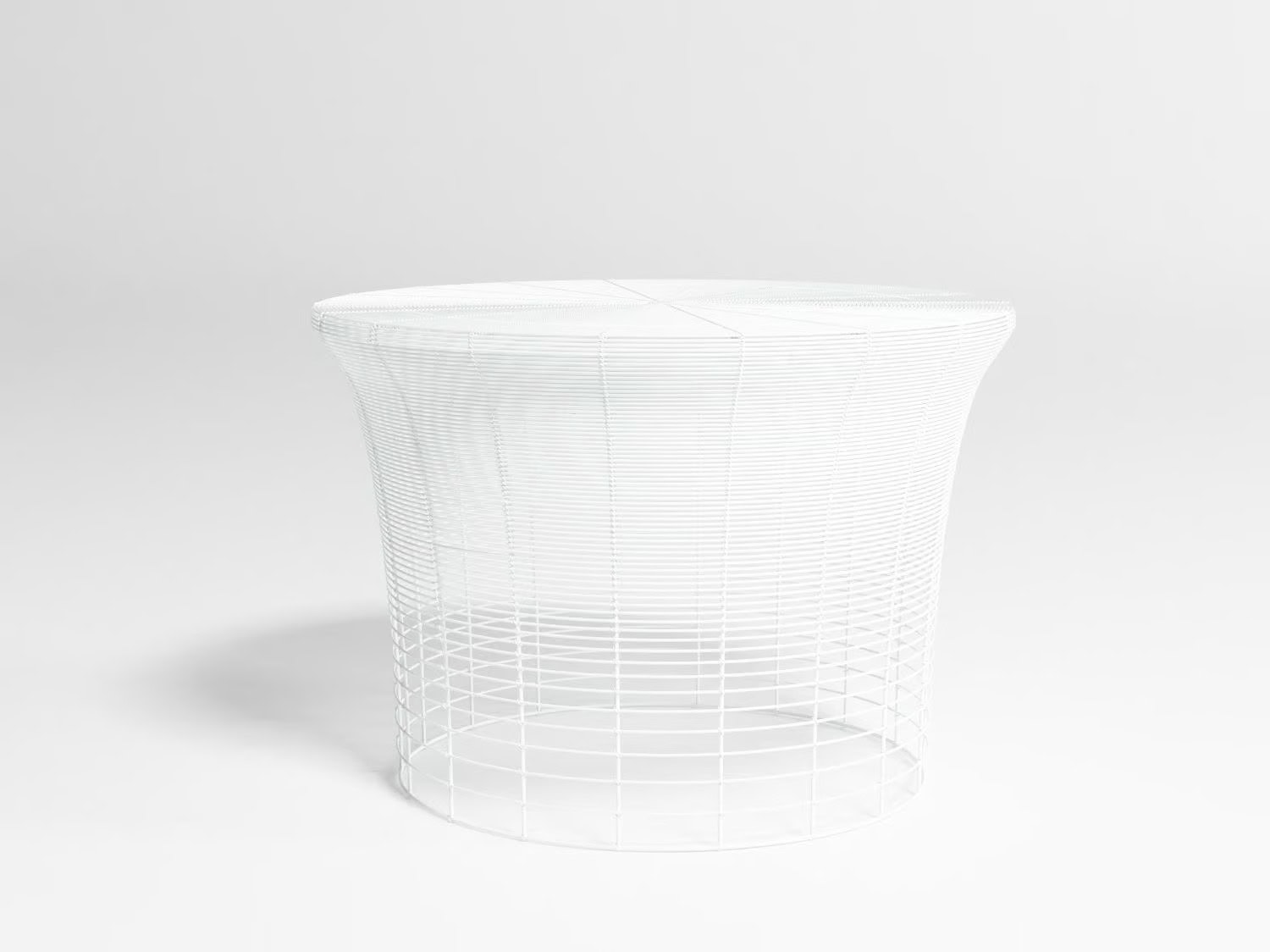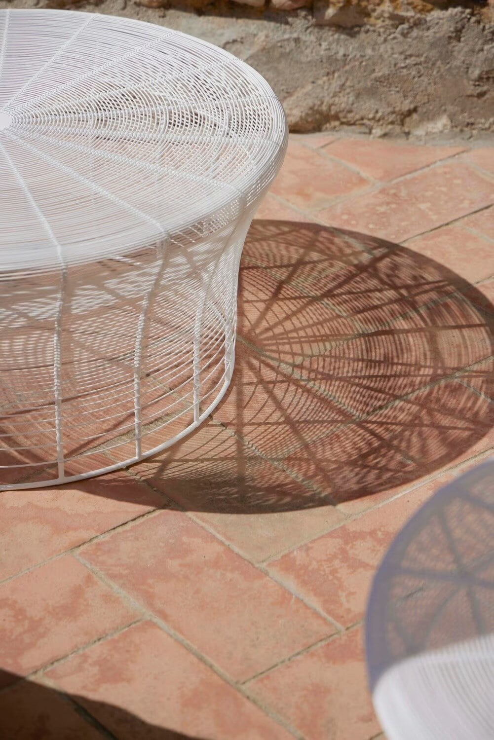 “Diese Kollektion von Hockern und Beistelltischen wird mittels der in Indien traditionellen Technik des Verflechten von Drähten rund um eine Struktur aus Metall hergestellt. Die zwischen den Drähten verbleibenden Zwischenräume werden schrittweise ausgedehnt, sodass ein Abstufungseffekt entsteht. Es handelt sich folglich um ein Design, das durch eine Änderung an einer schon vorhandenen Technik geschaffen wird.”