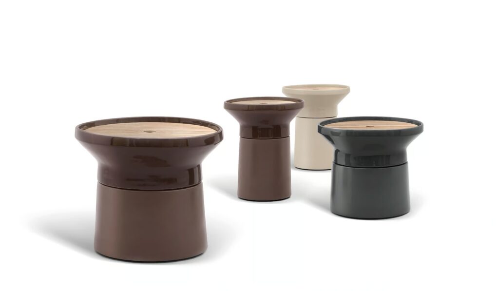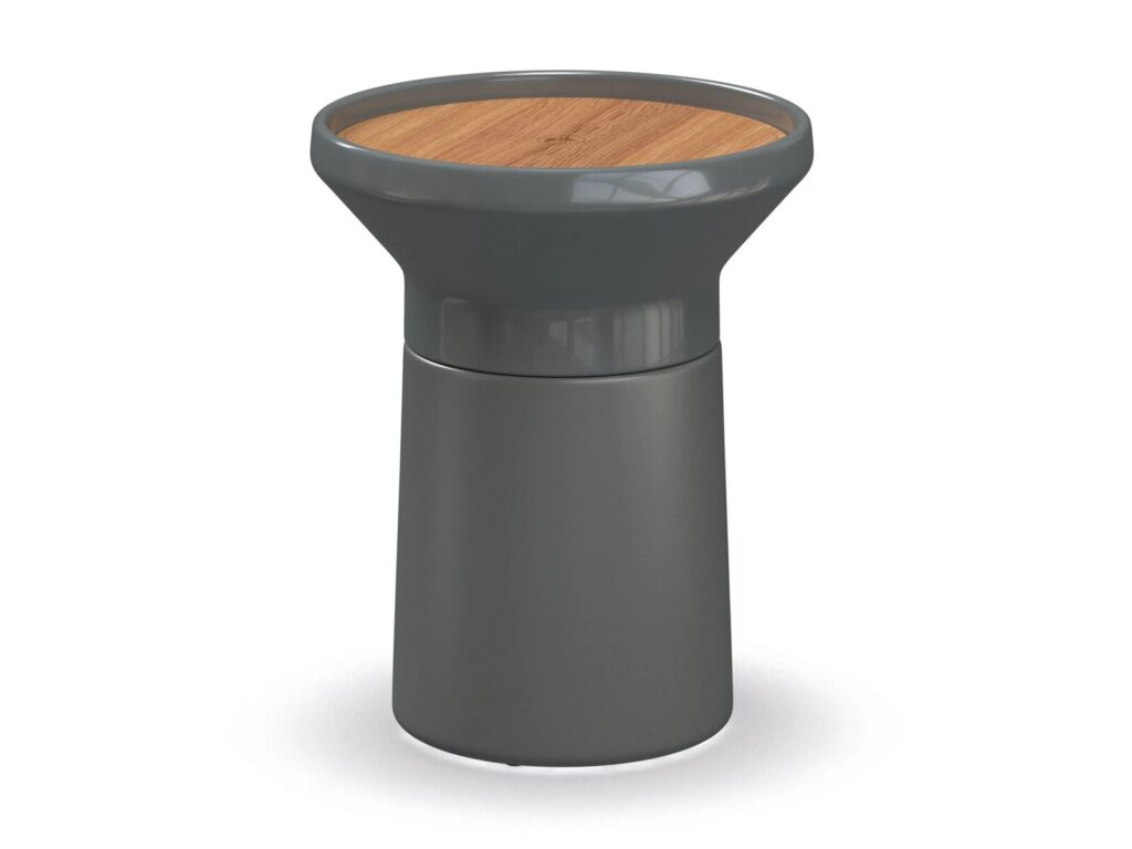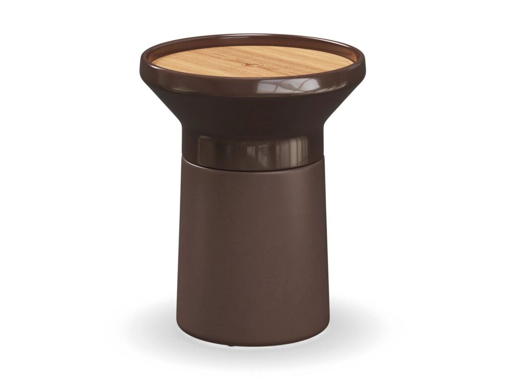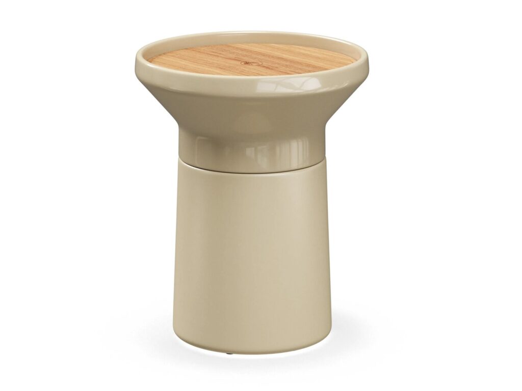 COSO - Runder Gartenbeistelltisch aus Keramik mit Teakholzplatte. Keramik ist die Grundlage der Coso Kollektion. Der auffällige Kontrast zwischen einer rustikalen, natürlichen Keramikoberfläche und einer tiefen Glasur mit natürlichen Lichtreflexen wird zu einem spielerischen Kontrakt, der durch das Mischen der drei verschiedenen, erdigen Farben noch unterstrichen werden kann.