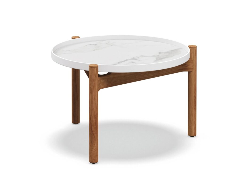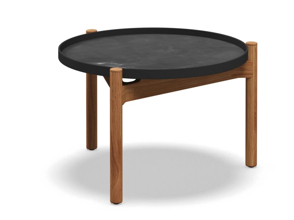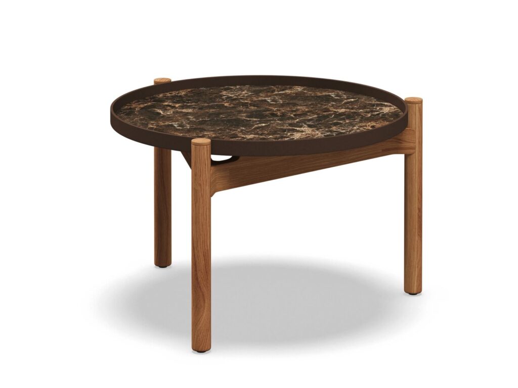 Sepal - Runder Beistelltisch aus Keramik und Teakholz für den Garten. Die Sepal-Kollektion lässt sich von den riesigen schwimmenden Seerosen inspirieren, die aussehen, als wären sie von Menschenhand geschaffen worden. Die Beistelltische bestehen aus einer Keramikplatte, die mit pulverbeschichtetem Aluminium umrandet ist und auf einem einfachen, aber wunderschön detaillierten, gleichseitigen Teakholzrahmen sitzt.