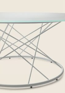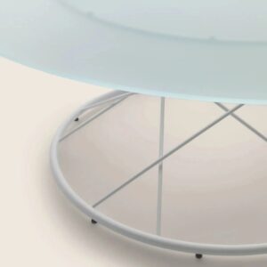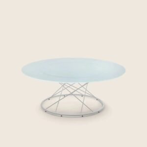 The tops of the dining tables, offered in various diameter sizes, range from the transparency of glass to the materiality of stone.