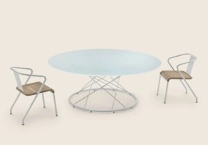 The tubular metal structure, powder-coated in a range of sophisticated colors, stands out for the refined interplay of lines in the base, which on one hand provides structural stability, while on the other adds lightness and movement to the composition.