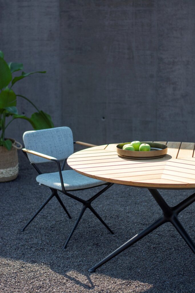 Welchen besseren Namen kann man für einen Stuhl finden, der aus zwei X-förmigen Rahmen besteht und ein grosses Mass an Komfort und Stil bietet, als ... Exes! Die fliessenden organischen Linien des Aluminiumrahmens werden nur durch die Teakholz Armlehnen unterbrochen, für ein warmes Gefühl. Die nahtlos integrierte Rückenplatte hat zwei X-förmige Öffnungen, die nicht nur als ästhetischer Blickfang, sondern auch als Befestigungspunkte für das Rückenpolster dienen. X-förmige Knöpfe, die standardmässig der Farbe des Rahmens entsprechen, fixieren das Rückenpolster. Um den Exes-Stuhl noch mehr zum Eyecatcher zu machen, werden diese X-förmigen Knöpfe optional auch in Teakholz angeboten.
