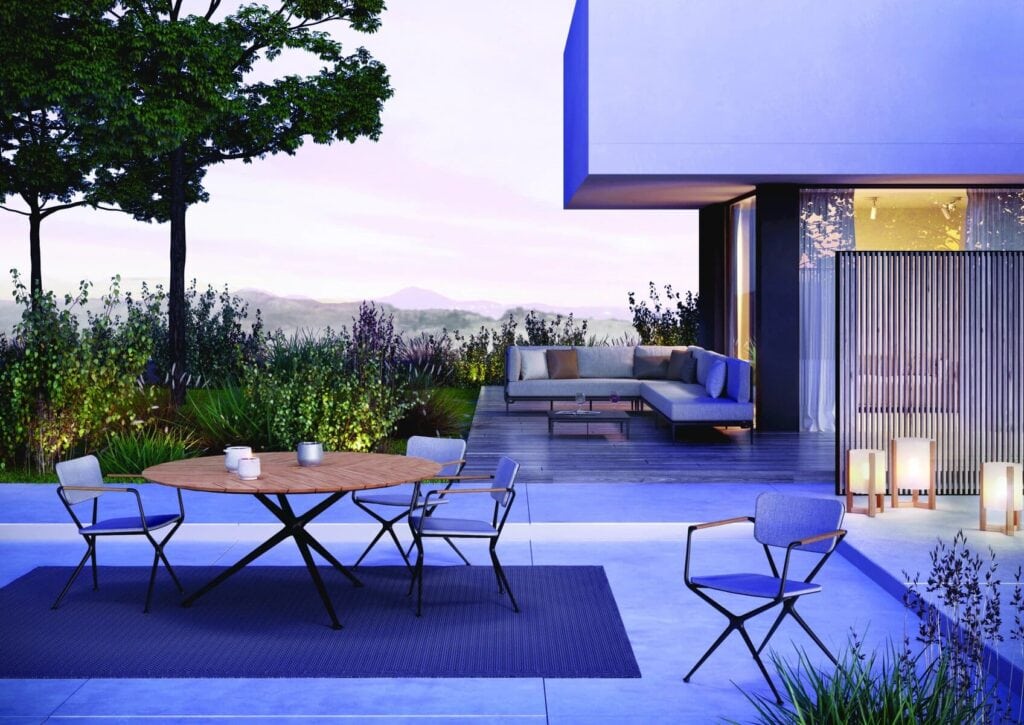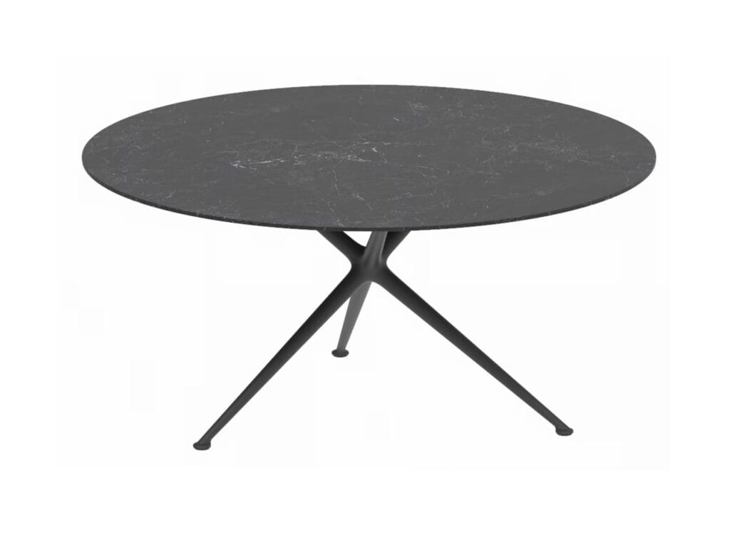 Exes ist ein Tisch mit einem Gestell aus Aluminiumguss, der mit verschiedenen Keramikplattenformen erhältlich ist: rund, rechteckig oder oval. Auch in Teakholzausführung erhältlich.