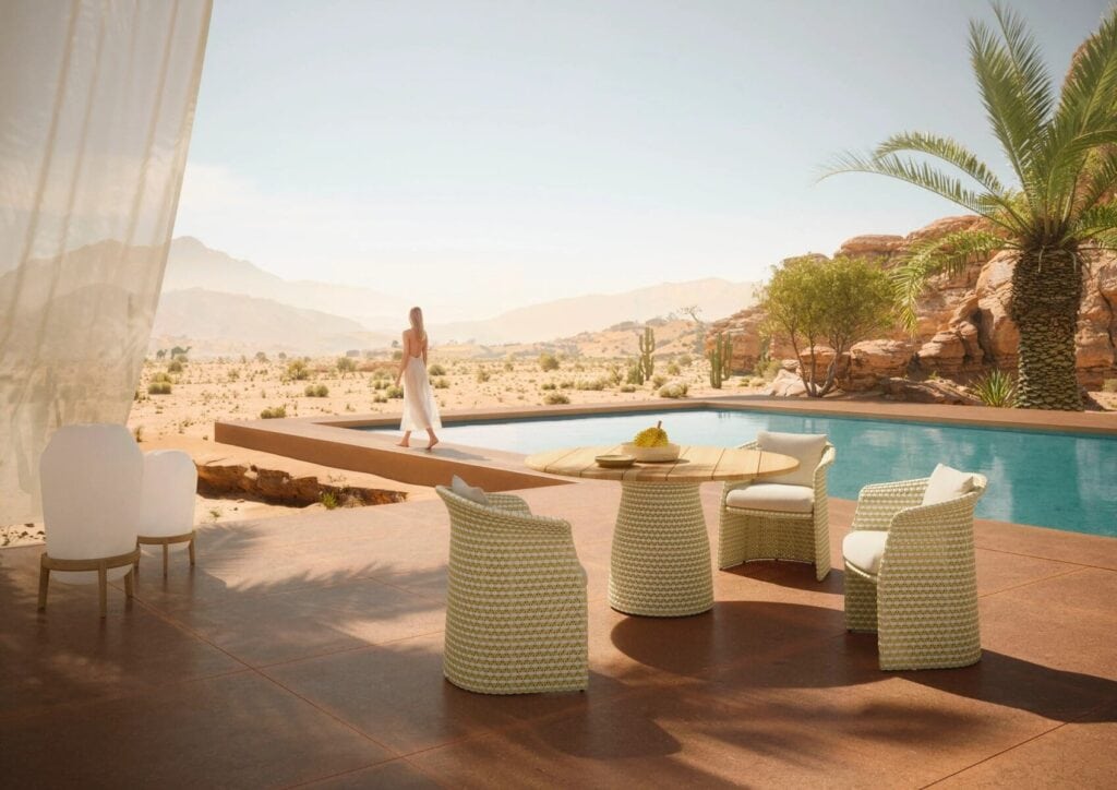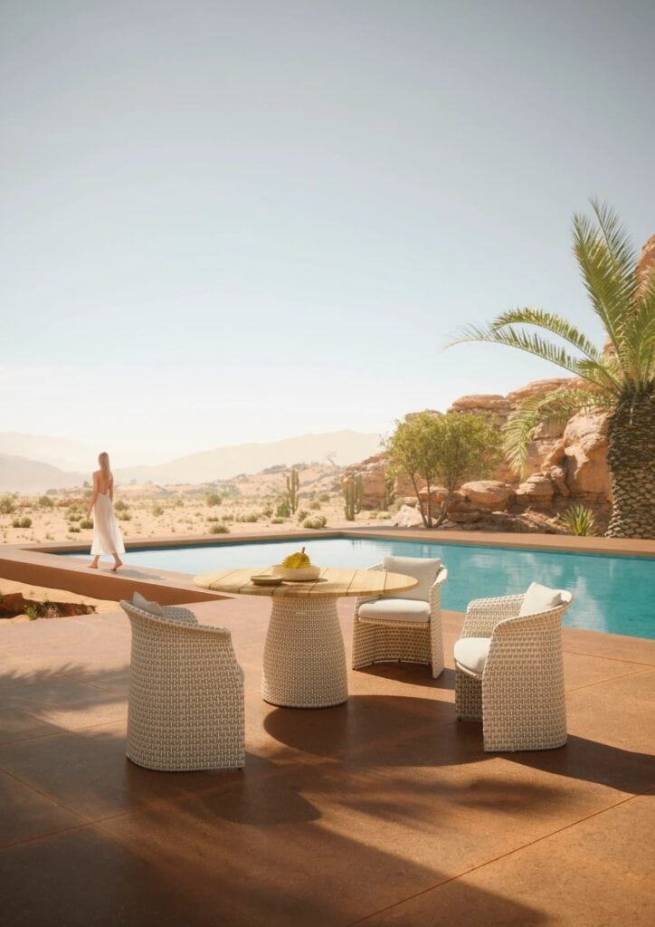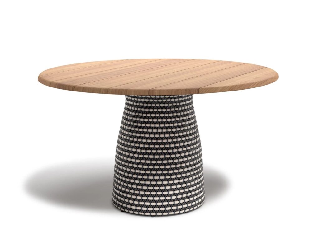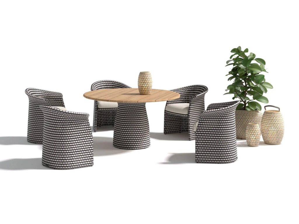 Die Meisterweber von DEDON haben mit viel Geschick ein grafisches Motiv geschaffen, das alle Kurven von FLLAIR elegant umschliesst, vom Sessel bis zum Esstisch, an dem bis zu fünf Personen bequem Platz finden, mit einer geflochtenen Basis und einer runden Teakholzplatte, die in jeder Umgebung Wärme ausstrahlt. Eine aussergewöhnlich breite horizontale Faser führt einen kontrastierenden Streifen ein, der anmutig jede Kurve durchläuft und an die natürlichen Wellen der griechischen Küstenlinie erinnert. FLLAIR ist in mehreren Farbvarianten erhältlich, die jeweils aus einer Verflechtung von drei harmonischen Schattierungen der DEDON-Faser bestehen, die der Kollektion eine einladende Wärme und einen unwiderstehlichen Charme verleihen.