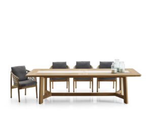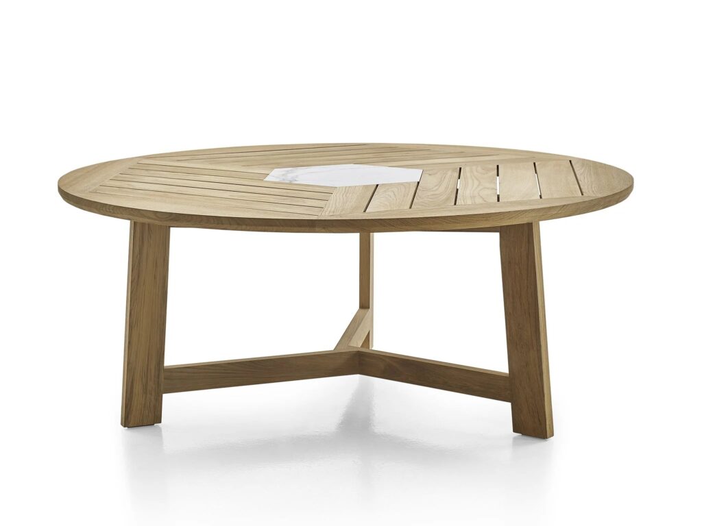 Eine Serie großer rechteckiger und runder Esstische, bei denen die Struktur und die Platten aus natürlichem Teakholz bestehen, das durch zentrale Einsätze aus weißem Calacatta-Porzellan bereichert wird. Die Serie umfasst auch einen Stuhl mit geschwungenen, harmonischen Linien, der eindeutig vom nordischen Design inspiriert ist. Die Struktur ist aus natürlichem Teakholz mit einem Geflecht aus Polypropylenfasern in Beige. Weiche Sitz- und Rückenkissen sorgen für Komfort.