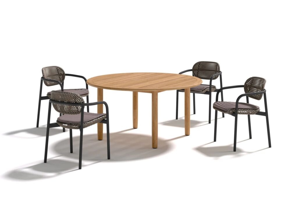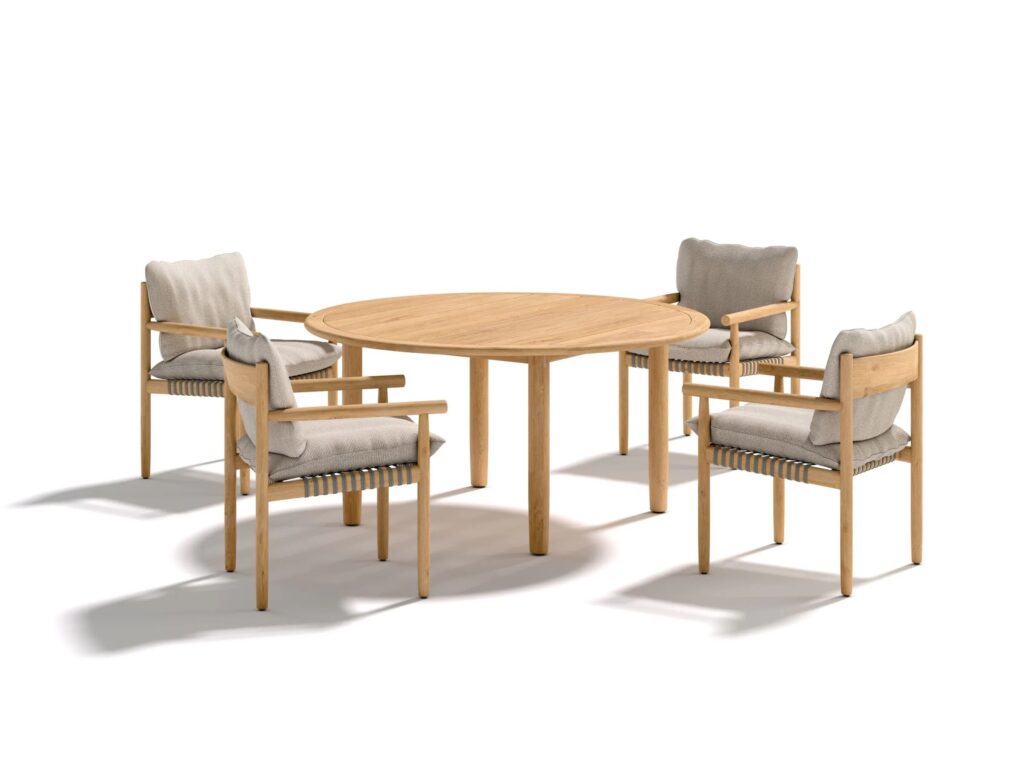 TIBBO ist ein runder Esstisch aus Teakholz.