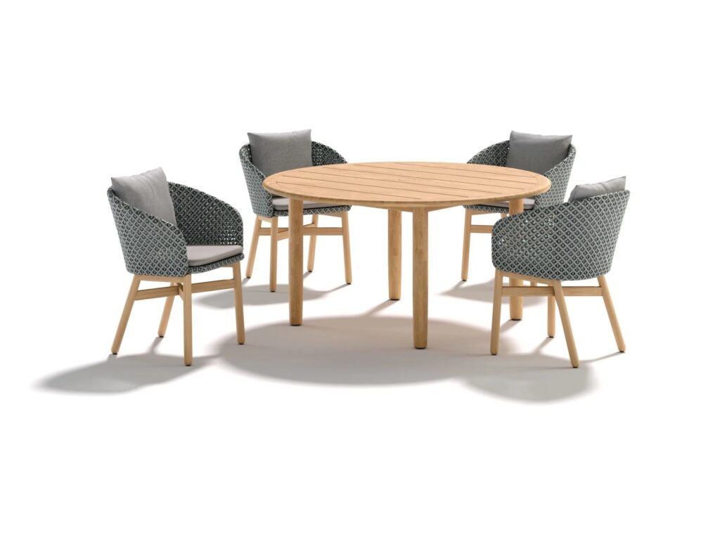 Die renommierten britischen Designer Edward Barber und Jay Osgerby entwarfen TIBBO für eine Zeit, in der Innen- und Aussenbereiche immer mehr miteinander verschmelzen. TIBBO ist die erste Teakholz-Kollektion von DEDON und vereint sorgfältige Handwerkskunst, überragenden Komfort und bemerkenswerte Leichtigkeit in einem Design, das unverwechselbar, elegant und rein ist. TIBBO besteht aus Ess- und Loungeelementen aus Teakholz, Textilien und gewebten Fasern und vermittelt ein aussergewöhnlich reiches und luxuriöses Aussehen und Gefühl. TIBBO zeichnet sich durch eine gewisse architektonische Strenge aus, sowohl in der Konstruktion als auch in den Proportionen. Die Rationalität des Designs wird jedoch durch die Wärme des Holzes, den Komfort der Kissen, das natürliche Aussehen der speziell entwickelten Faser und die segelartige dreidimensionale Kurve der geformten Rückenlehnen ausgeglichen. Die Kollektion wird in Handarbeit aus hochwertigem Teakholz gefertigt, das aus nachhaltigen Plantagen stammt. Hochwertiges Teakholz bietet eine hohe Witterungsbeständigkeit und Haltbarkeit auch unter extremen Bedingungen. In Innenräumen behält TIBBO seinen goldenen Farbton. Im Freien, wenn es unbehandelt bleibt, erhält es auf natürliche Weise eine silbergraue Patina, die, so die Designer, „dem Design eine weitere Ebene der Qualität verleiht“.