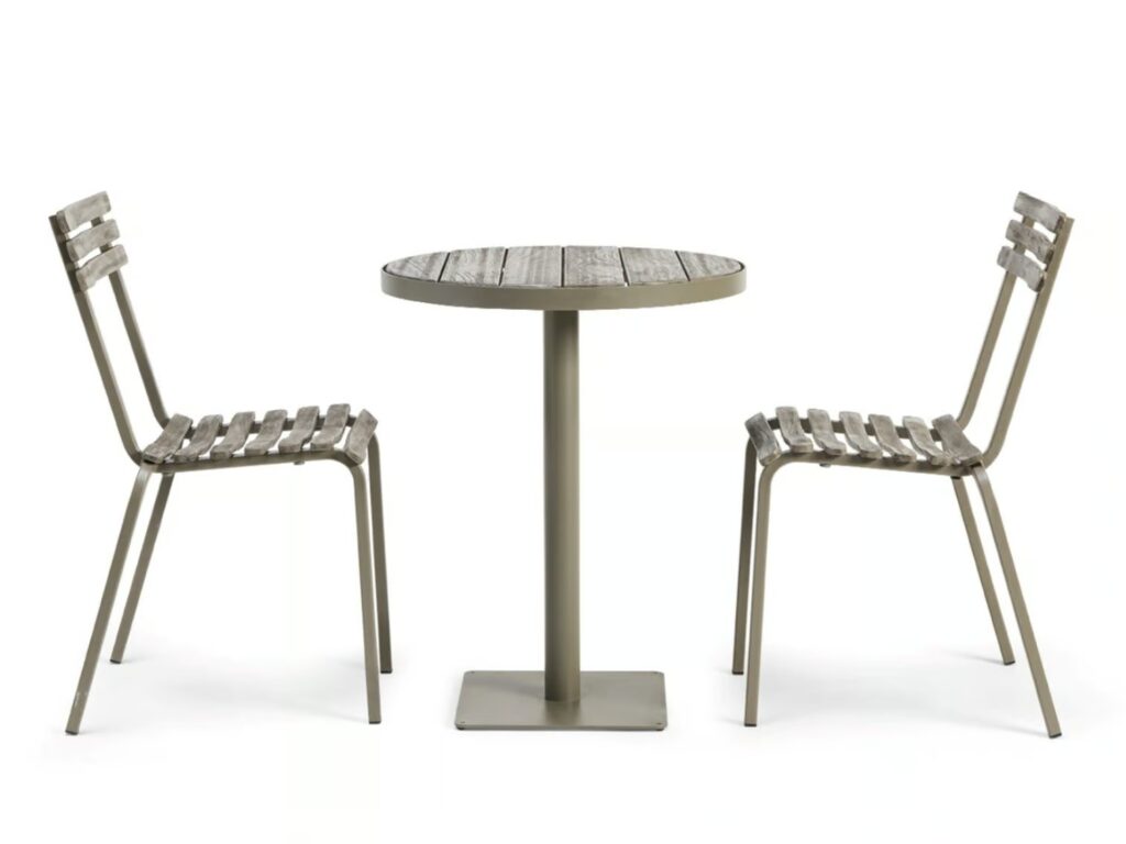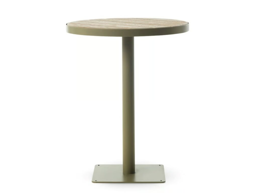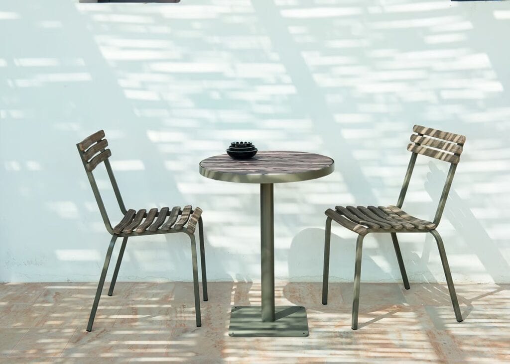 Tisch mit Metallstruktur und Platte aus gebeiztem Teakholz.