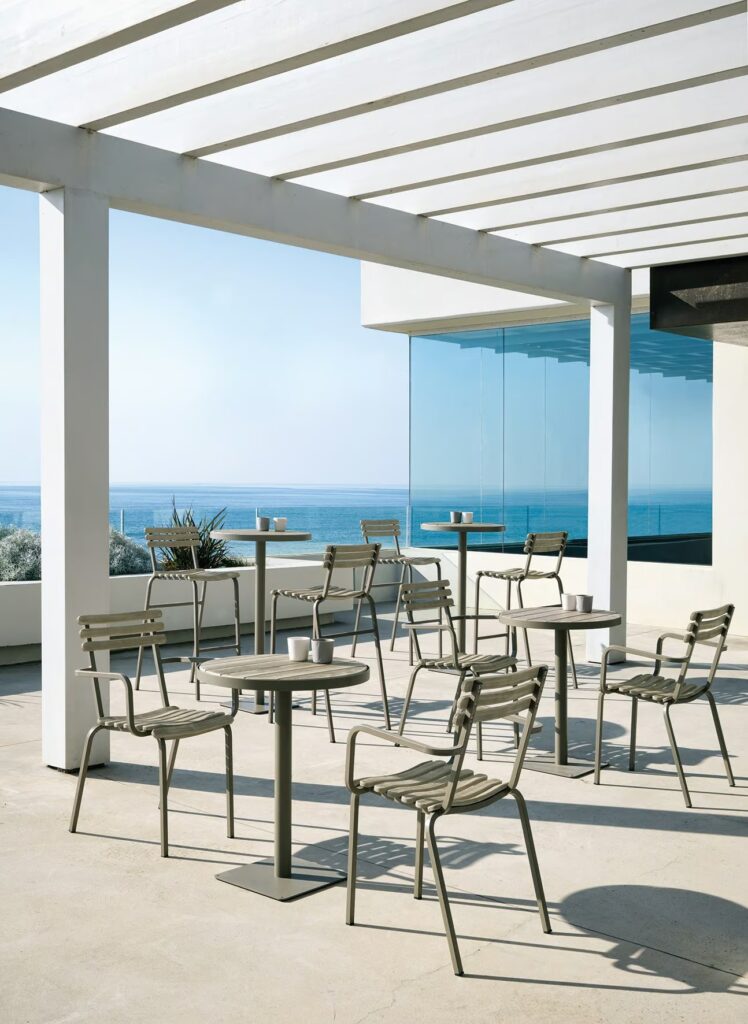 Grosse Kollektion aus Metallund Teakholz, bestehend aus Tischen und Sitzflächen für den privaten oder gewerblichen Gebrauch.