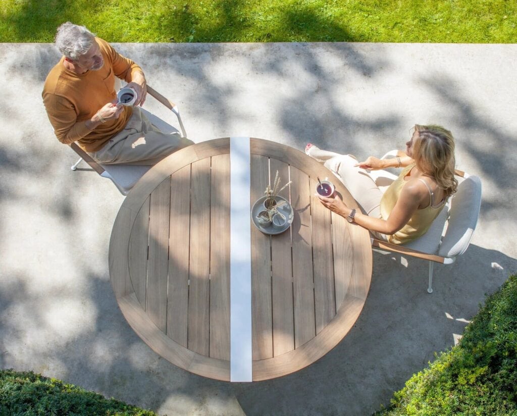 Exes ist ein Tisch mit einem Gestell aus Aluminiumguss, der mit verschiedenen Keramikplattenformen erhältlich ist: rund, rechteckig oder oval. Auch in Teakholzausführung erhältlich.