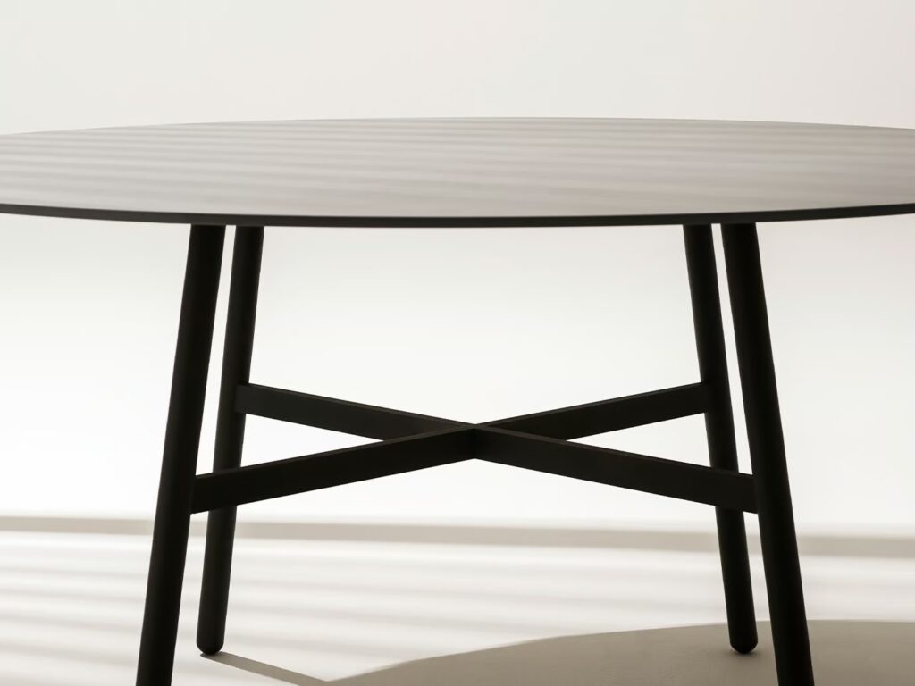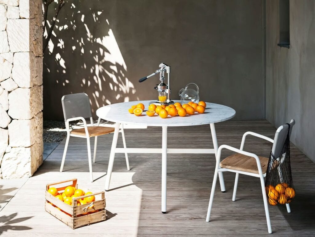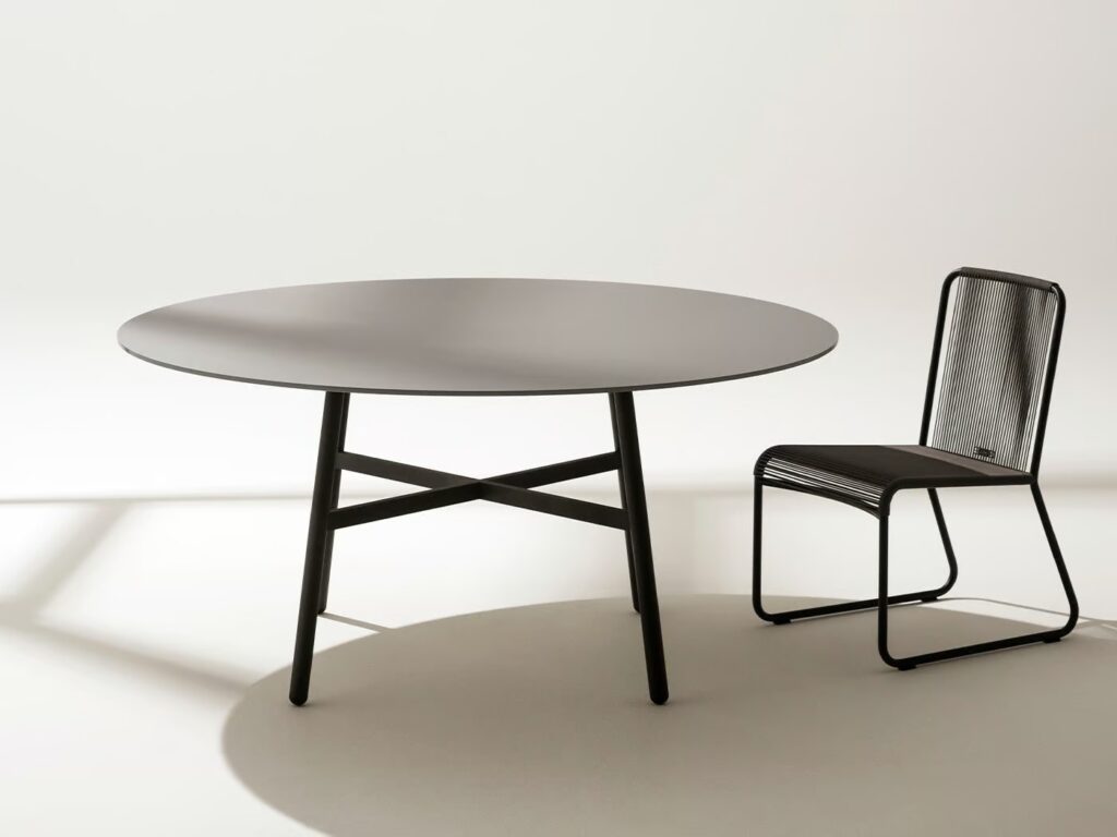 The shape is defined by slender steel legs, connected by a cross structure, and a round tabletop, available in two sizes, which can be made from gres or natural teak slats; Carrara white marble, Farsena stone, or Luna stone for the 130 cm diameter model.