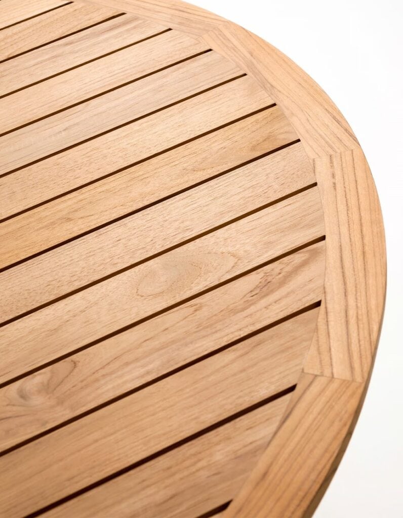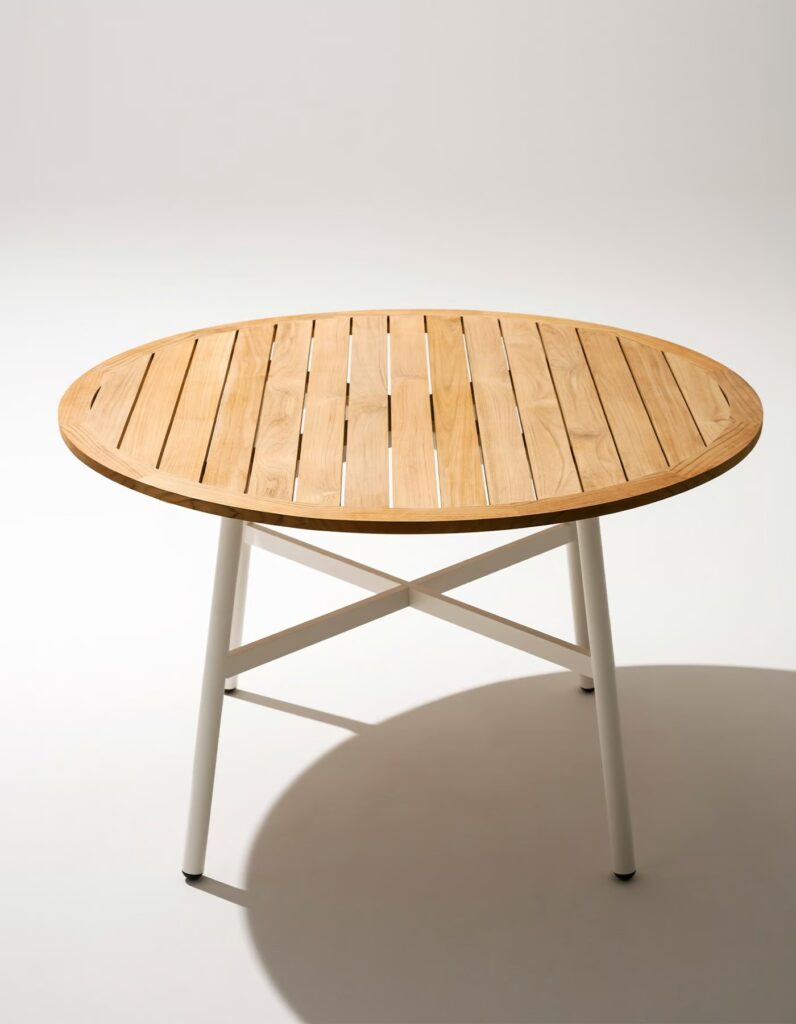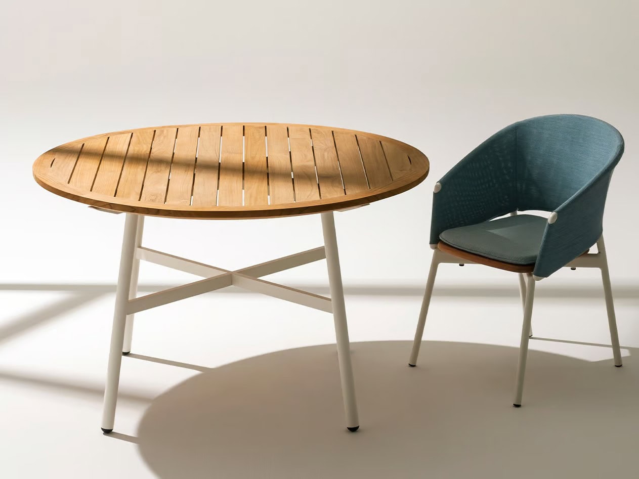 The shape is defined by slender steel legs, connected by a cross structure, and a round tabletop, available in two sizes, which can be made from gres or natural teak slats; Carrara white marble, Farsena stone, or Luna stone for the 130 cm diameter model.