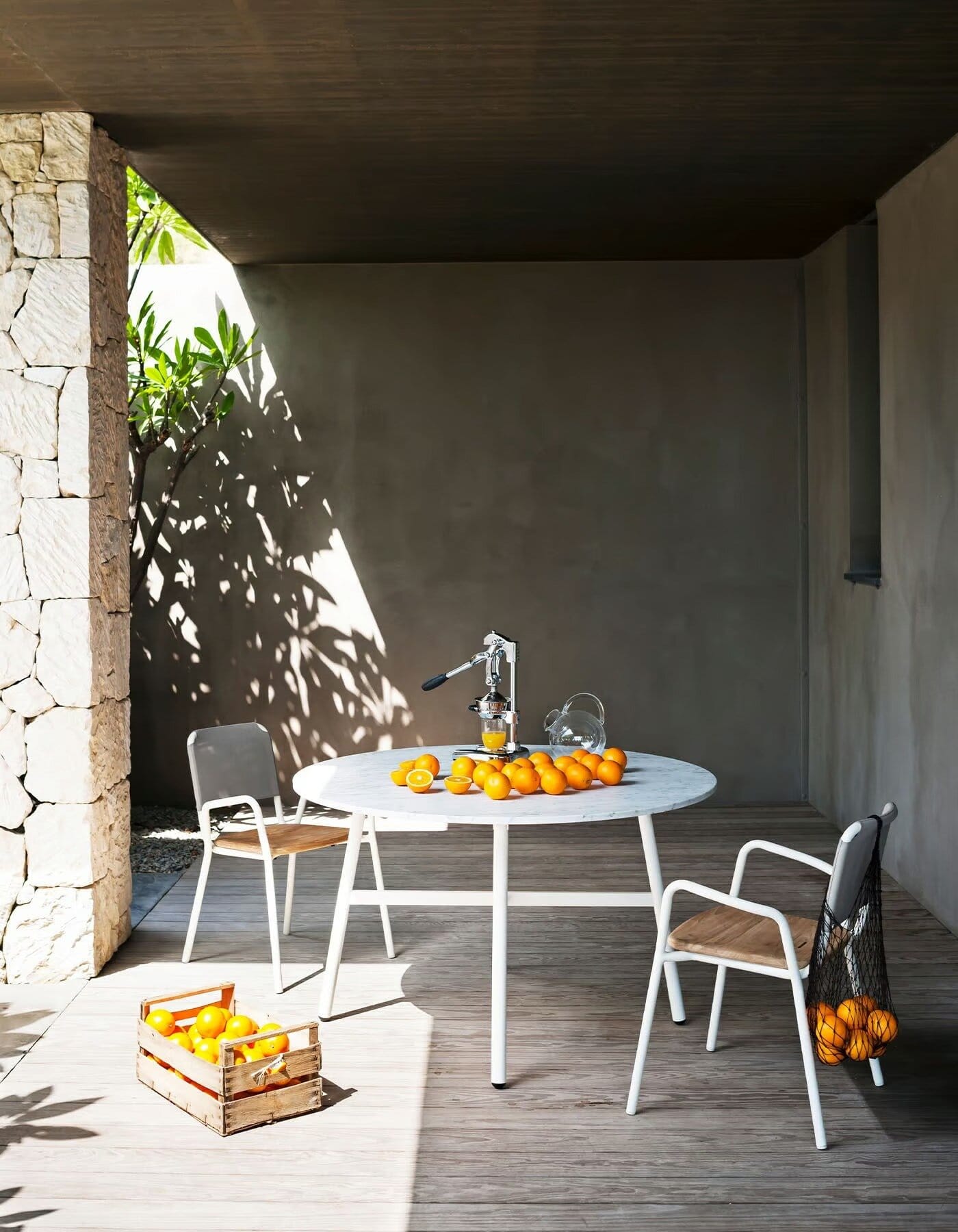 Gamma is a round outdoor table with a rigorous and essential design, capable of enhancing the beauty of the different materials with which the tabletop can be made, as well as the unique combinations that result.