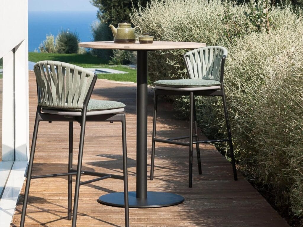 Button ist eine Kollektion von Tischen für den Außenbereich mit runden oder quadratischen Platten in zwei verschiedenen Größen, leicht und vielseitig. Eine Kollektion, die mit Geschmack und Diskretion sowohl einen kleinen Großstadtbalkon als auch die große Terrasse eines Restaurants am Meer einrichten kann. Die Tische für den Außenbereich bestehen aus einem Aluminiumgestell und vereinen Funktionalität, Zweckmäßigkeit und Langlebigkeit. Zu den Modellen der Kollektion gehören ein Loungetisch, der mit Sesseln und Sofas kombiniert werden kann, und eine barhohe Variante. Vervollständigt wird die Kollektion durch einen vielseitigen Beistelltisch für den Außenbereich mit runder Basis und Platte. Dank der verschiedenen Plattenmaterialien wie Aluminium, Keramik oder Teakholz - sowohl in der Ausführung mit natürlichem Holz als auch in der weiß lackierten Version - können die Tische sowohl im Objektbereich als auch im Wohnbereich mit Schlichtheit und Eleganz ausgestattet werden.