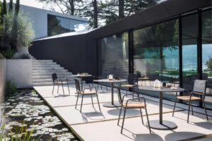 Button ist eine Kollektion von Tischen für den Außenbereich mit runden oder quadratischen Platten in zwei verschiedenen Größen, leicht und vielseitig. Eine Kollektion, die mit Geschmack und Diskretion sowohl einen kleinen Großstadtbalkon als auch die große Terrasse eines Restaurants am Meer einrichten kann. Die Tische für den Außenbereich bestehen aus einem Aluminiumgestell und vereinen Funktionalität, Zweckmäßigkeit und Langlebigkeit. Zu den Modellen der Kollektion gehören ein Loungetisch, der mit Sesseln und Sofas kombiniert werden kann, und eine barhohe Variante. Vervollständigt wird die Kollektion durch einen vielseitigen Beistelltisch für den Außenbereich mit runder Basis und Platte. Dank der verschiedenen Plattenmaterialien wie Aluminium, Keramik oder Teakholz - sowohl in der Ausführung mit natürlichem Holz als auch in der weiß lackierten Version - können die Tische sowohl im Objektbereich als auch im Wohnbereich mit Schlichtheit und Eleganz ausgestattet werden.
