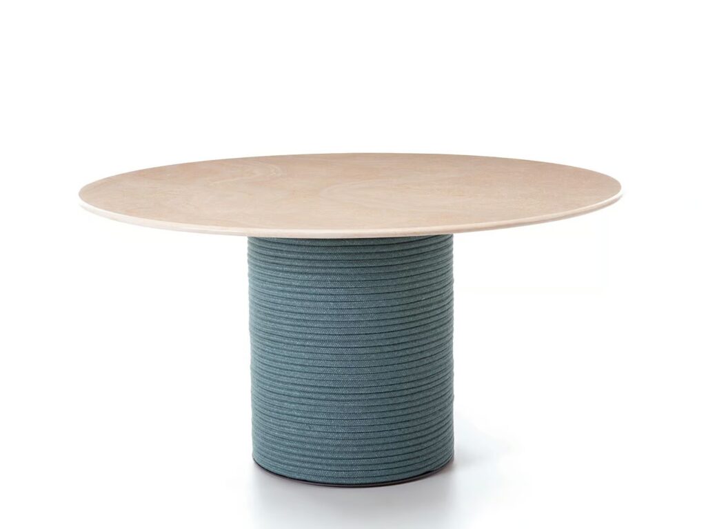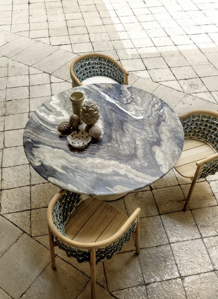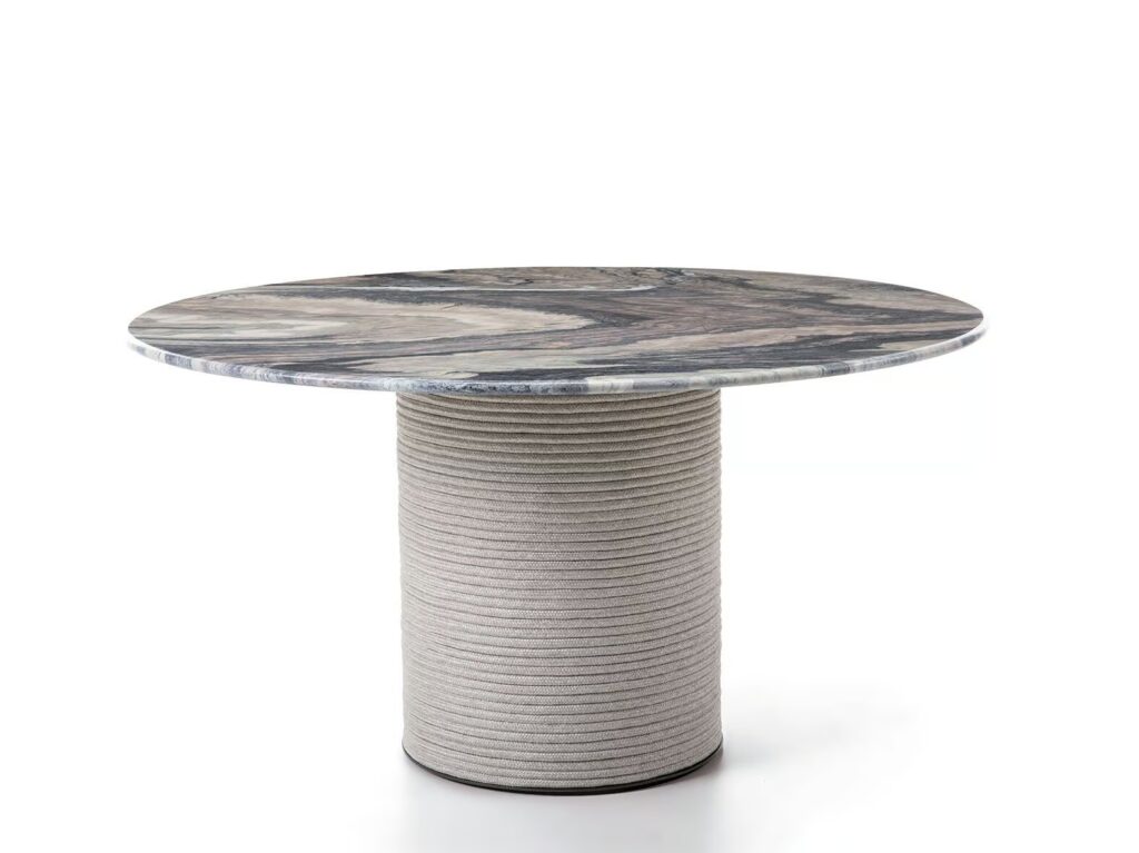 Patio ist ein runder Tisch mit Tischplatten aus Cipollino-Marmor und Travertinstein.