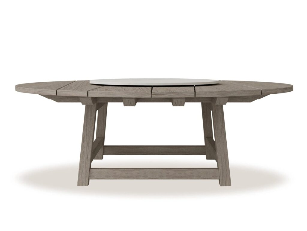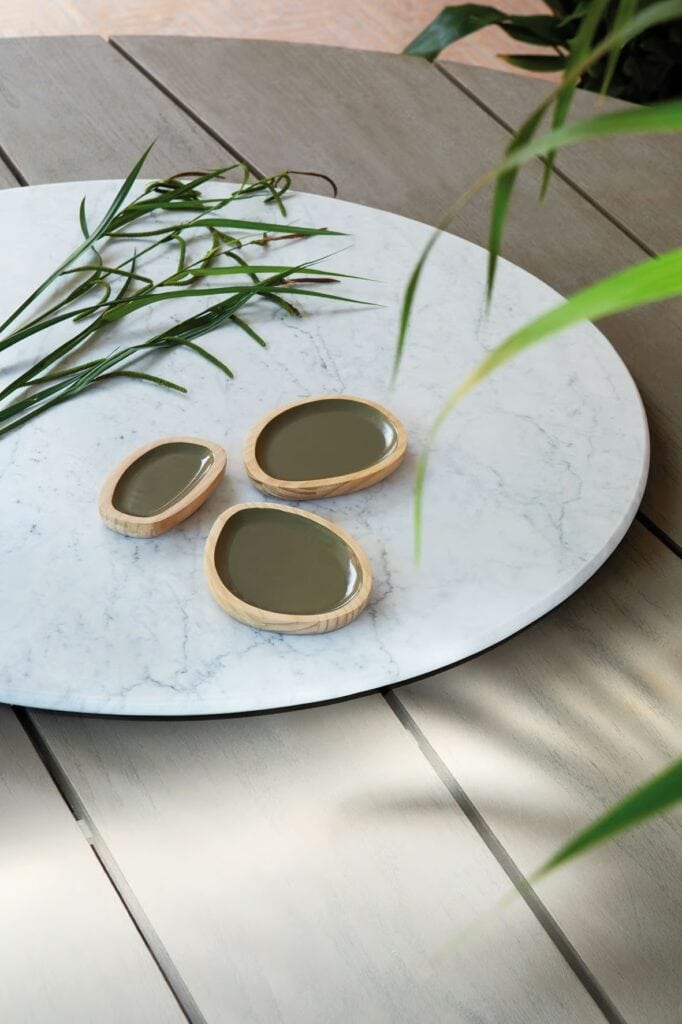 Statuarischer Marmor und emaillierter Lavastein mit seiner intensiven und leuchtenden Farbe, die das an die verschiedenen Schattierungen des Meeres erinnernde Material hervorhebt, erscheinen unregelmässig und bilden die Tischplatten. Die hochwertige und gekonnte Verarbeitung von Stein und Marmor verleiht ihnen aussergewöhnliche Asymmetrien und Geometrien, Formen, die die Gäste „umarmen“ und eine neue Erfahrung von Geselligkeit vermitteln. Die Tische sind in zwei Grössen (264 x 155 cm oder 160 x 160 cm) erhältlich und besitzen die gleiche Stabilität und Wärme wie die Lounge-Elemente aus gebürstetem oder gebeiztem Teakholz. Die Kombination von edlen Materialien wie Holz und Stein erzeugt so faszinierende Effekte und prägt die gesamte Umgebung, in der die Möbel stehen. Der Esstisch Rafael ist in einer weiteren Variante verfügbar, die vollständig aus Teakholz besteht und ebenfalls in gebürsteter oder gebeizter Ausführung sowie mit einer runden Platte mit einem Durchmesser von 230 cm erhältlich ist. Diese Version kann um ein sehr markantes Element ergänzt werden, das den Tisch noch funktioneller macht: Lazy Susan, eine drehbare Platte aus statuarischem Marmor mit einem Durchmesser von 110 cm.
