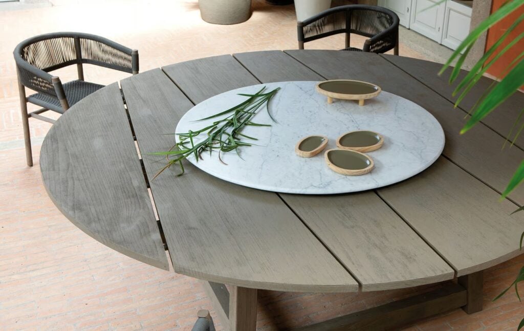 Rafael ist ein runder Teakholztisch mit Lazy Susan von Ethimo, Design von Paola Navone.