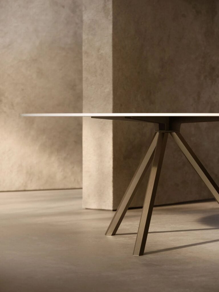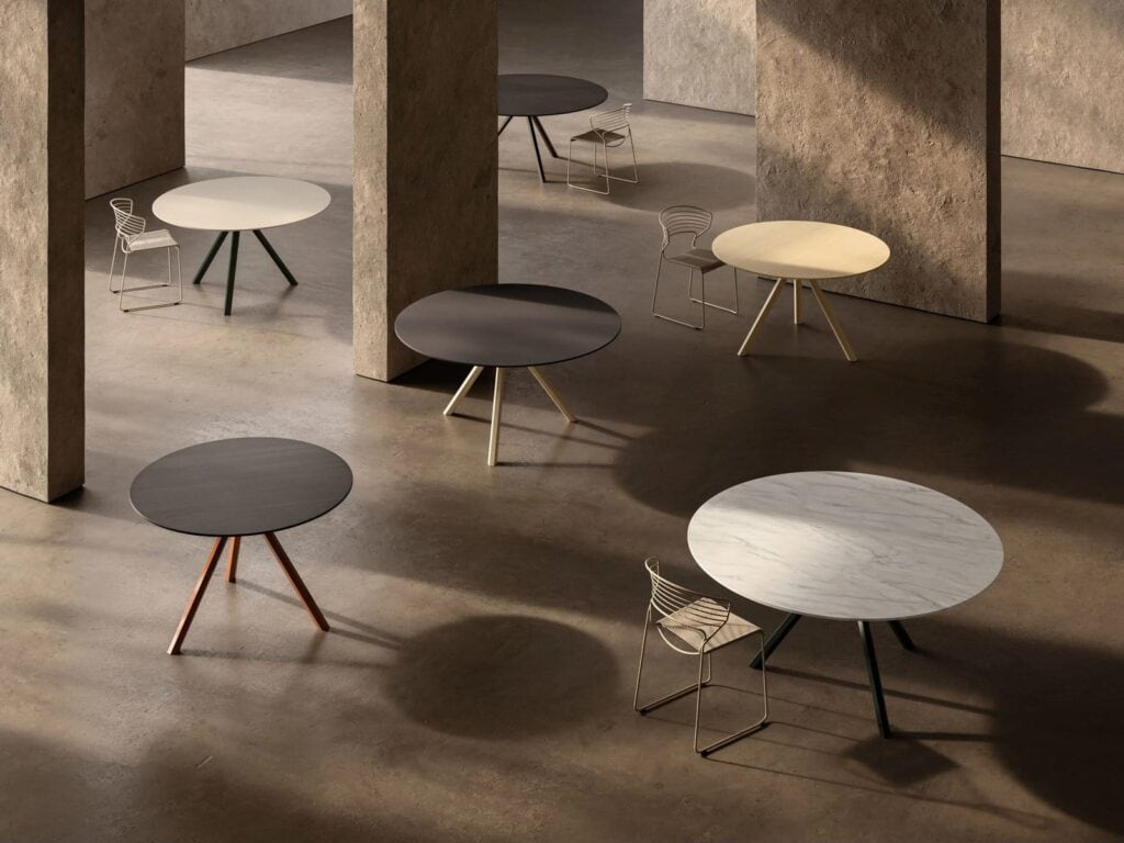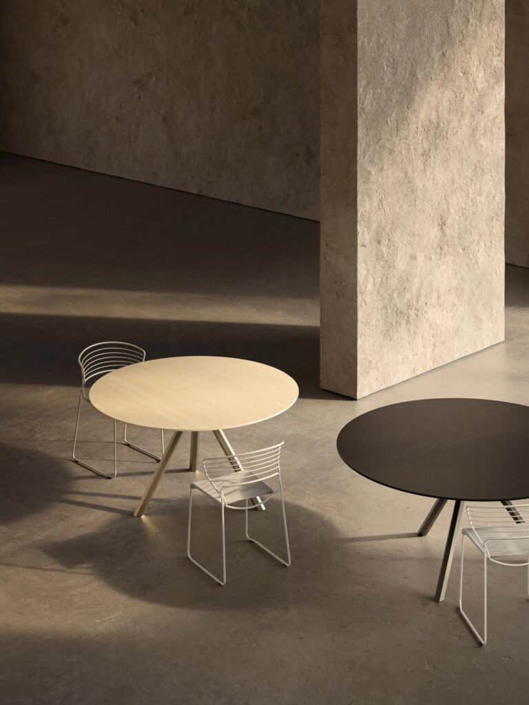 Die auf dem Salone del Mobile 2023 vorgestellte Tischkollektion Heb wird durch neue runde Platten in verschiedenen Grössen erweitert und eignet sich damit sowohl für den privaten als auch für den Objektbereich. Heb Round ist ein Tisch von zeitloser Eleganz, ein Meisterwerk des zeitgenössischen Designs und der Handwerkskunst. Dieser neue runde Tisch mit drei Beinen ist mit Platten in drei verschiedenen Ausführungen erhältlich, die sich perfekt in jedes Ambiente einfügen, ob modern oder klassisch. Diese neuen Geometrien beinhalten die Einführung eines neuen Beins, das das charakteristische sechseckige Rohr des Heb-Designs beibehält, aber in den Abmessungen überarbeitet wurde, was dem Endprodukt einen skulpturalen Wert verleiht. Das sechseckige Bein stellt mit seiner einzigartigen geometrischen Form ein unverwechselbares Designelement dar, das jeder Umgebung Modernität und Originalität verleiht. Der dreibeinige Metalltisch HEB Round ist ein perfektes Beispiel für zeitgenössisches Design und Funktionalität. Die Beine, die aus einer robusten Stahlzarge bestehen, sind mit einer sechseckigen Messingabdeckung versehen. Die Beine können mit prestigeträchtigen galvanischen Behandlungen versehen werden. Die Tischplatte ist in drei Ausführungen erhältlich: Marmor, Holzfurnier und handgekachelter Beton. HEB Round passt sich an verschiedene Umgebungen an, vom Esszimmer bis zum Büro, und verleiht jeder Umgebung Modernität und Stil.