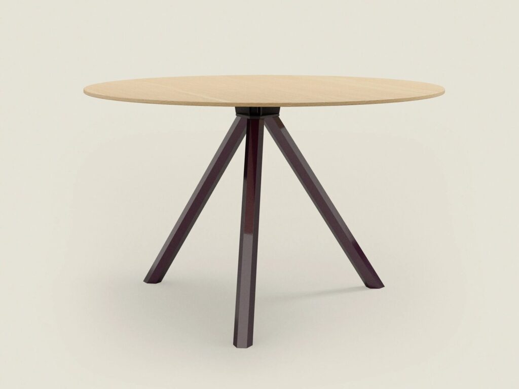 HEB ROUND ist ein dreibeiniger Tisch mit einer Stahlstruktur, die von einer Messingrohrverkleidung mit sechseckigem Querschnitt bedeckt ist. Die Stützen der Platte bestehen aus lasergeschnittenen, glimmergrau lackierten Stahlrohren. Die Platte ist aus handgekacheltem MDF, Eschenholz oder 20 mm dickem Marmor mit einer durch eine klare Polyesterbeschichtung mit Matteffekt geschützten Oberfläche erhältlich.