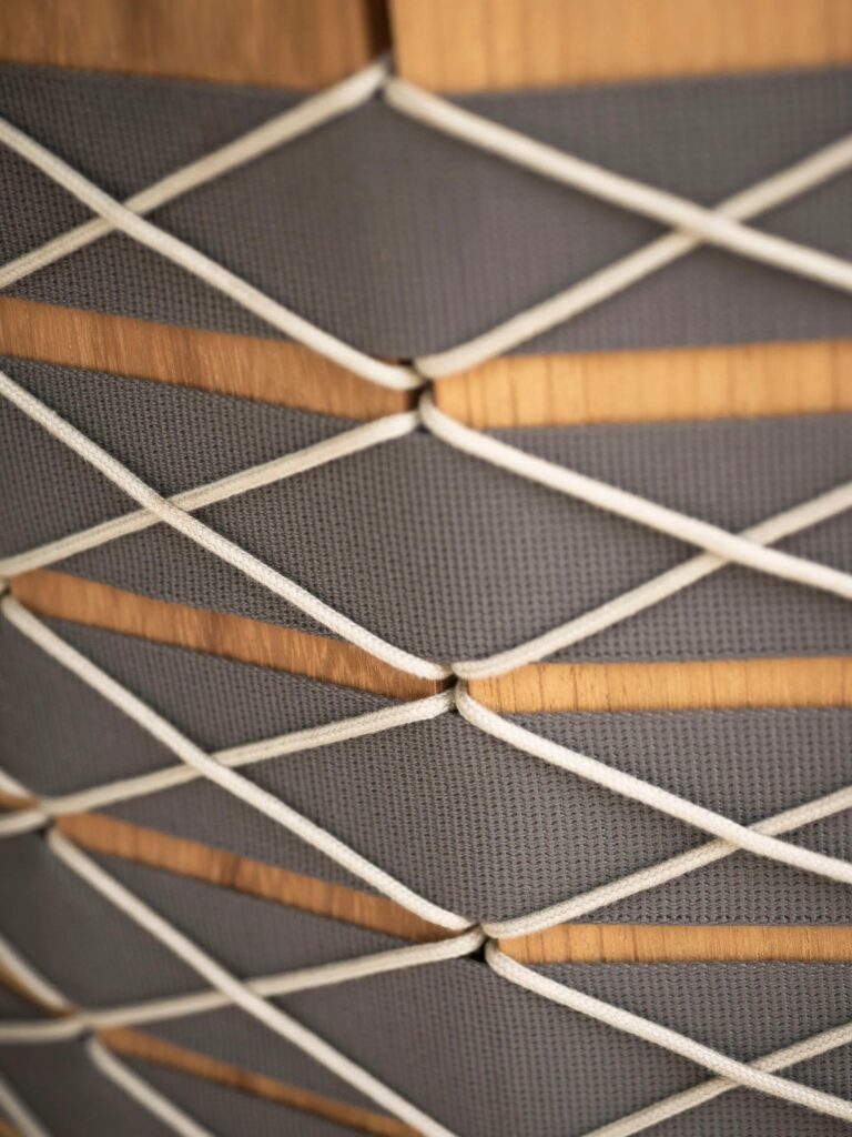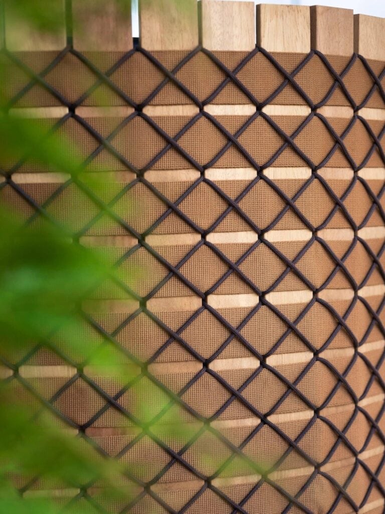 Struktur und Dekoration werden so zu einem Ganzen aus verschiedenen Materialien, wobei das Holz eine neue Form und Rolle in dieser Ergänzung für Außenmöbel mit handwerklichem Charakter entdeckt.